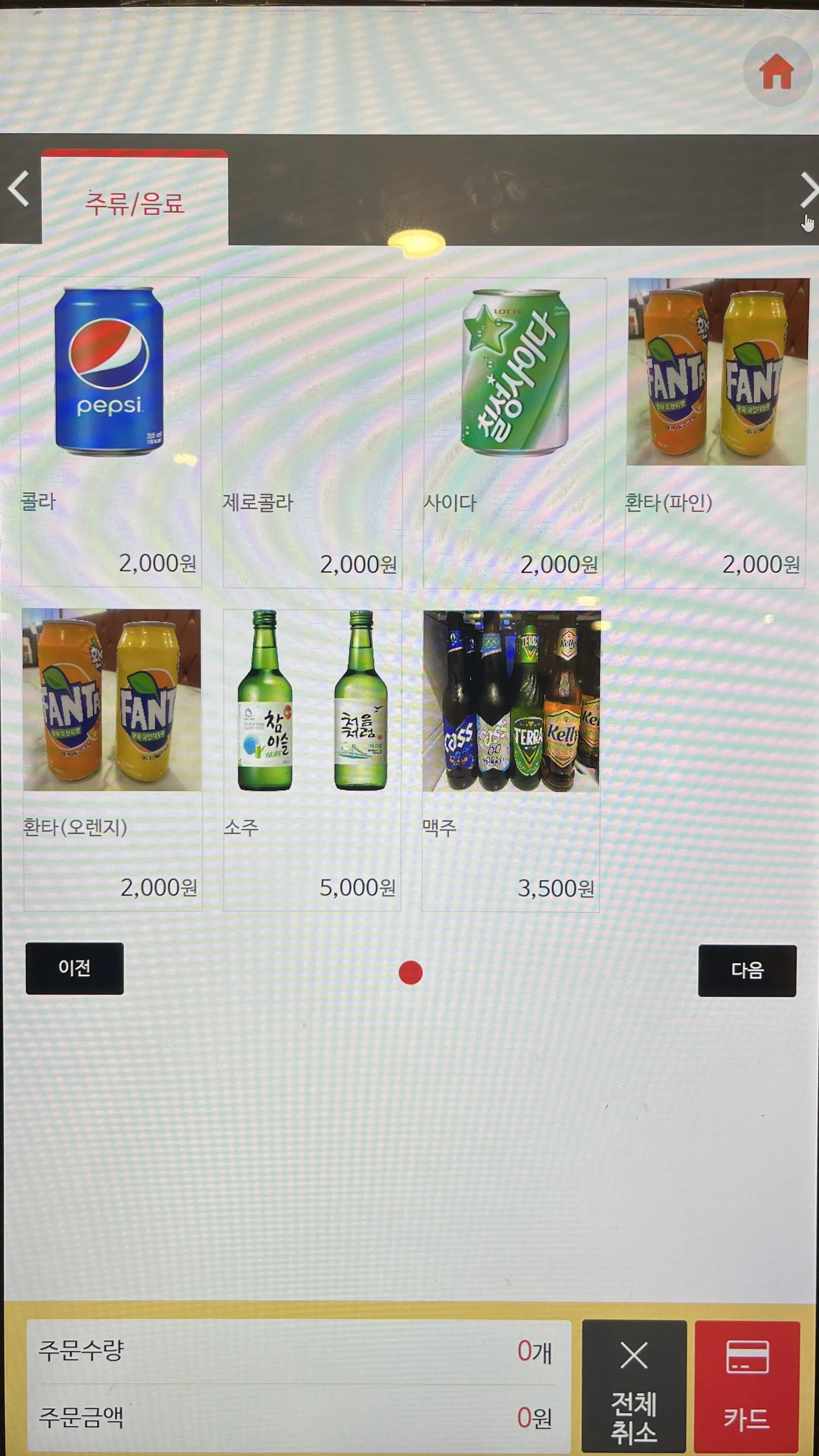 사이드 메뉴 칸 다음으로는 주류 및 음료를 고르는 칸이 있다. 하지만 아이콘을 눌러 페이지를 이동하는 방법 외엔 주류 및 음료도 판매한다는 사실을 알기 어려웠다. 살짝이라도 주류 및 음료 칸을 보여주거나 해서 사용자가 쉽게 알 수 있도록 도와주면 좋을 것 같다.