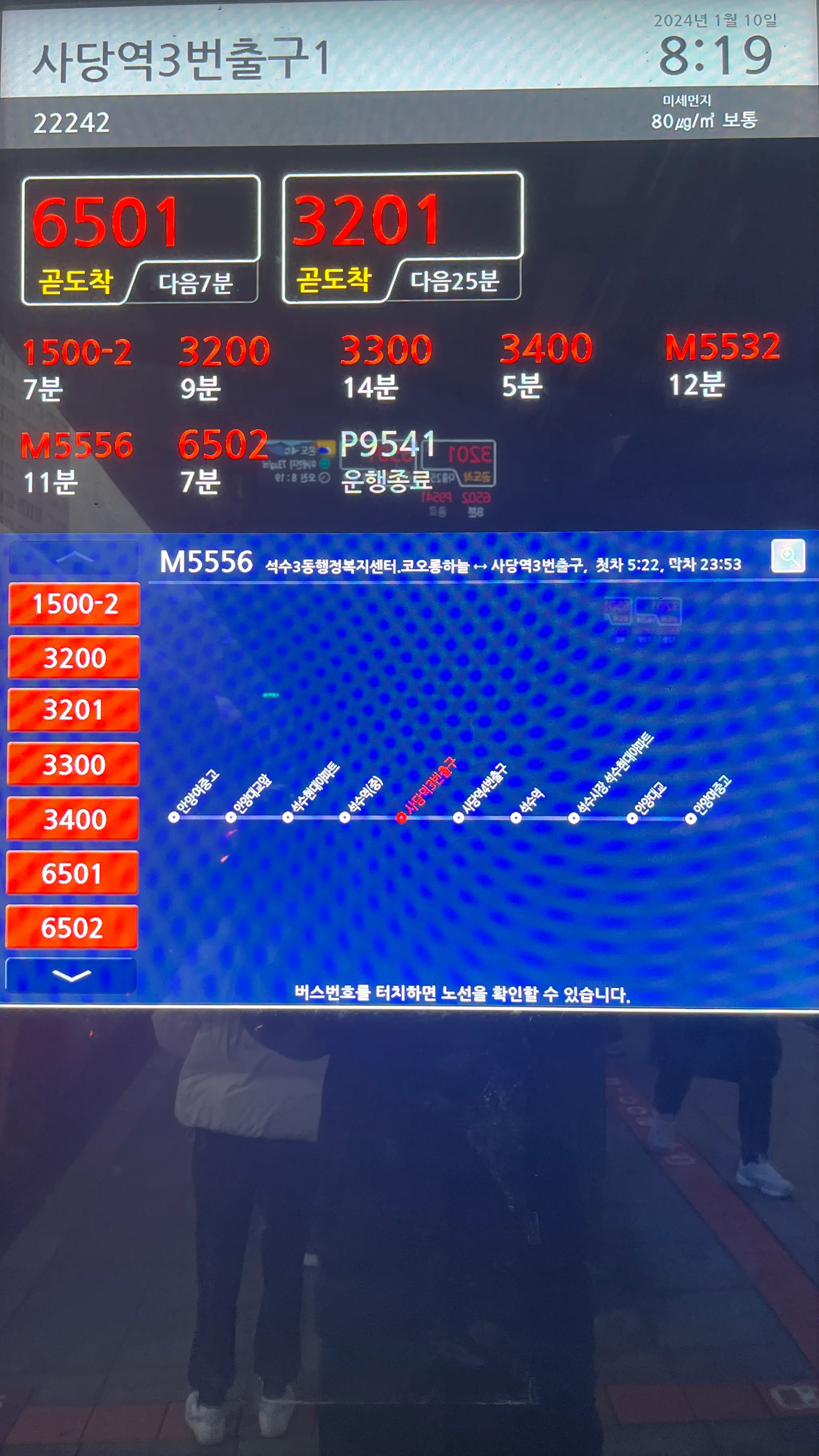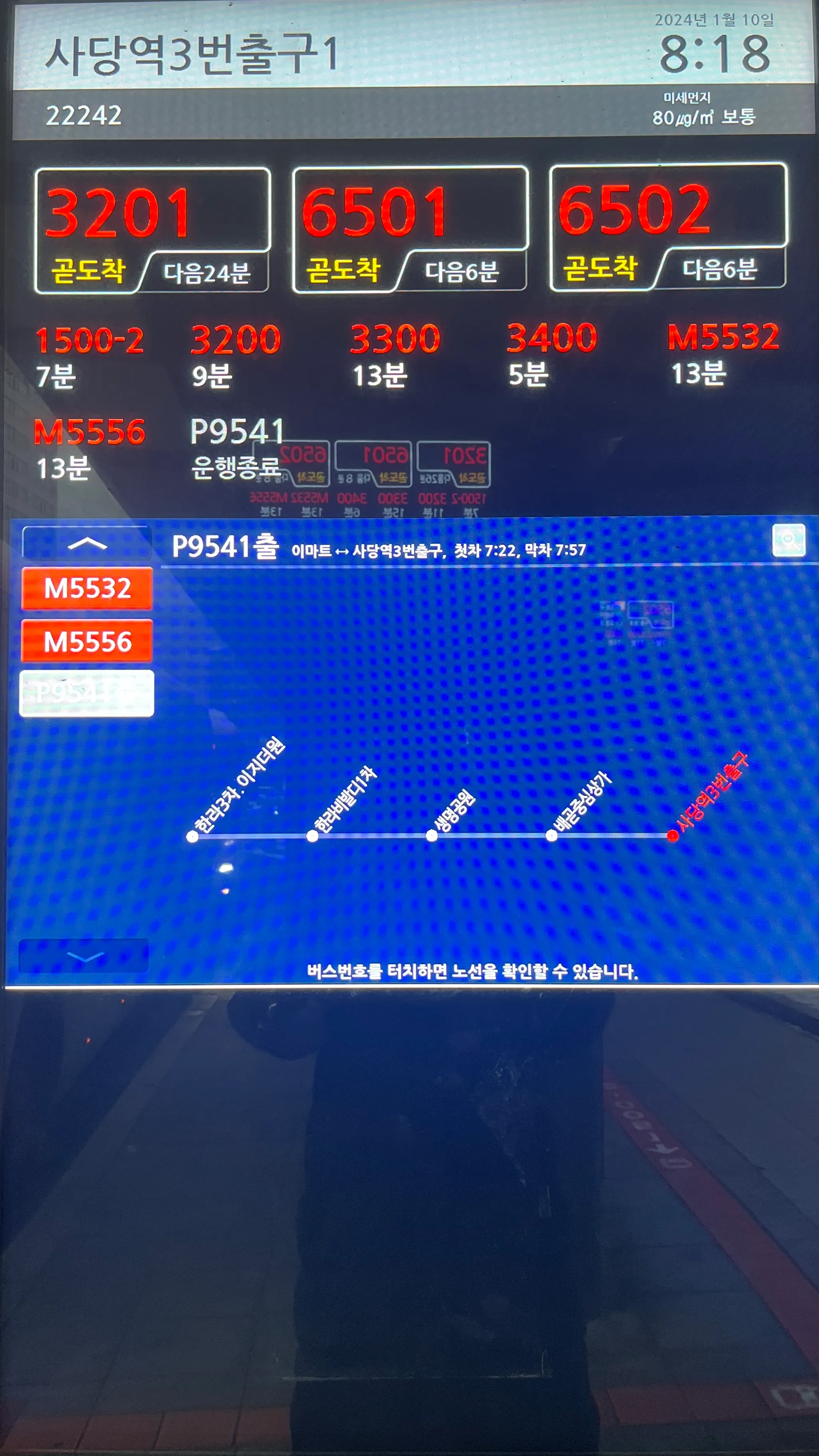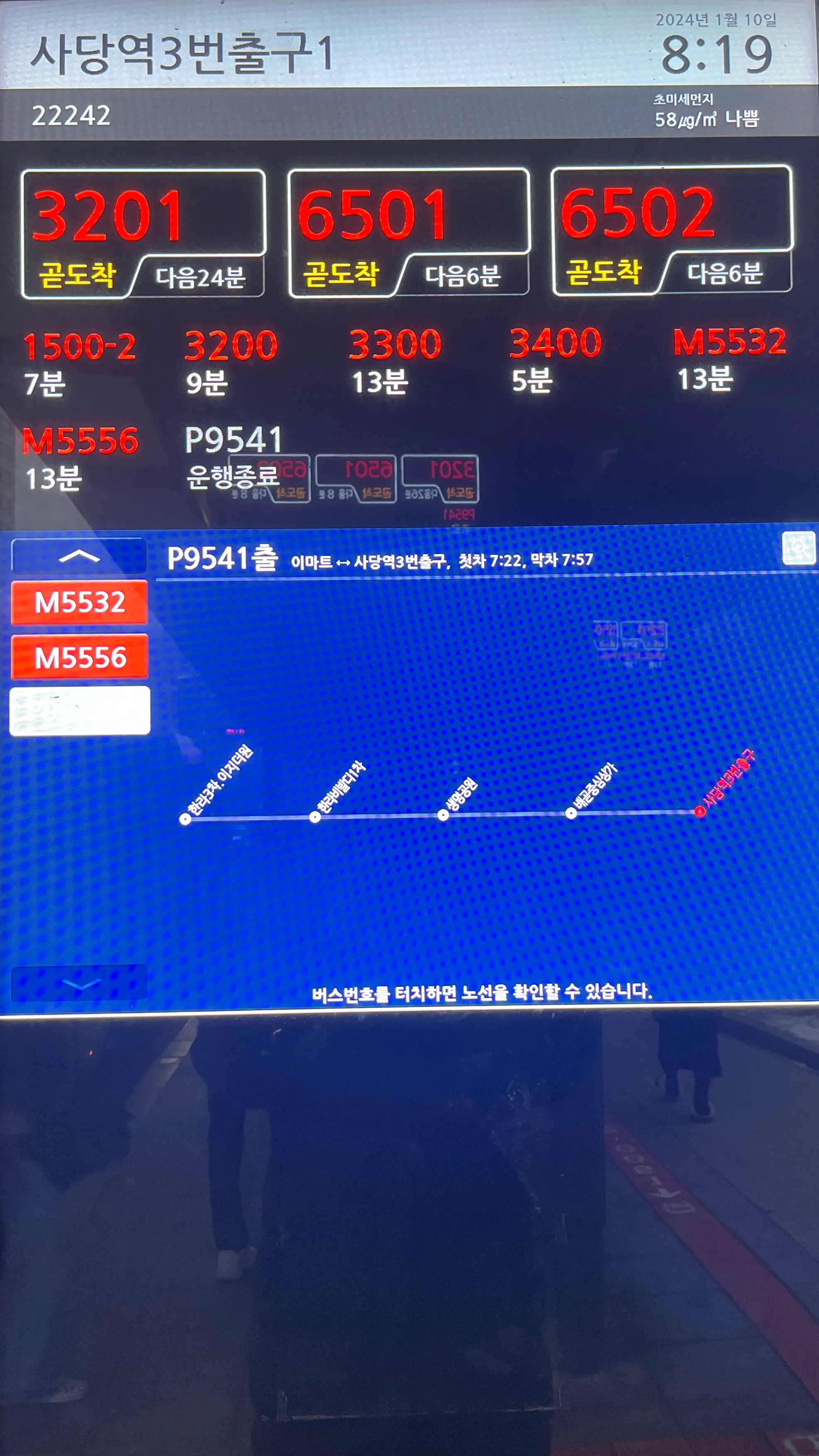 사당역 버스정류장에 설치된 버스노선 안내 전광판. 타 지역 전광판도 수집할 예정.