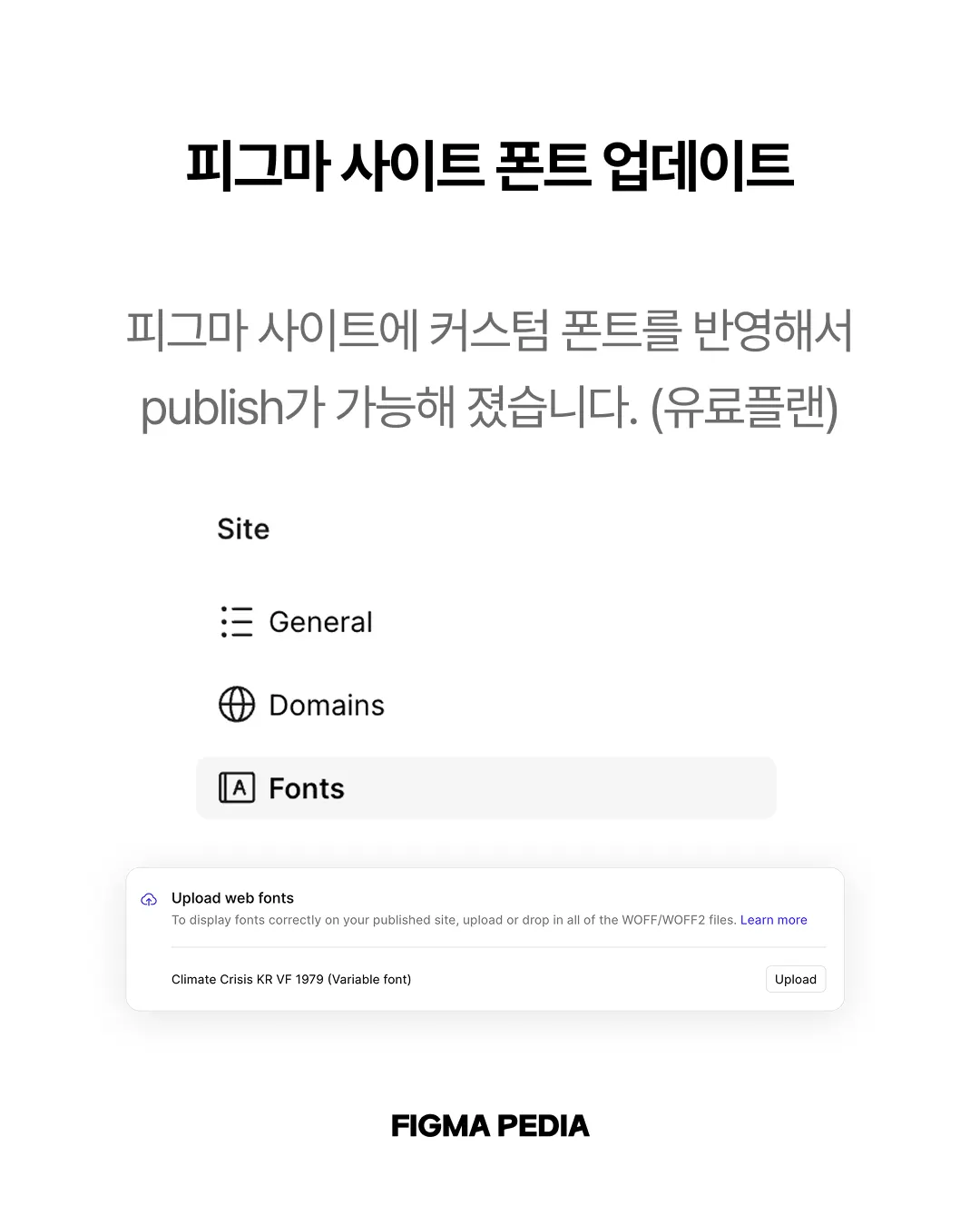 : 구글 폰트만 사용이 가능하던 피그마 사이트에서 드디어 다양한 폰트(구글 외 폰트, 내 로컬 폰트 등)를 사용할 수 있게 되었습니다. Publish 전 setting > Font에서 WOFF or WOFF2 폰트파일을 업로드하시면 됩니다 (유료플랜 기능)