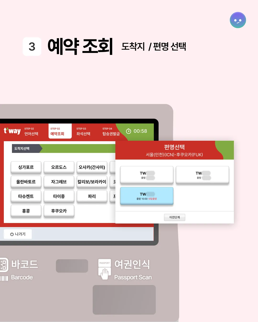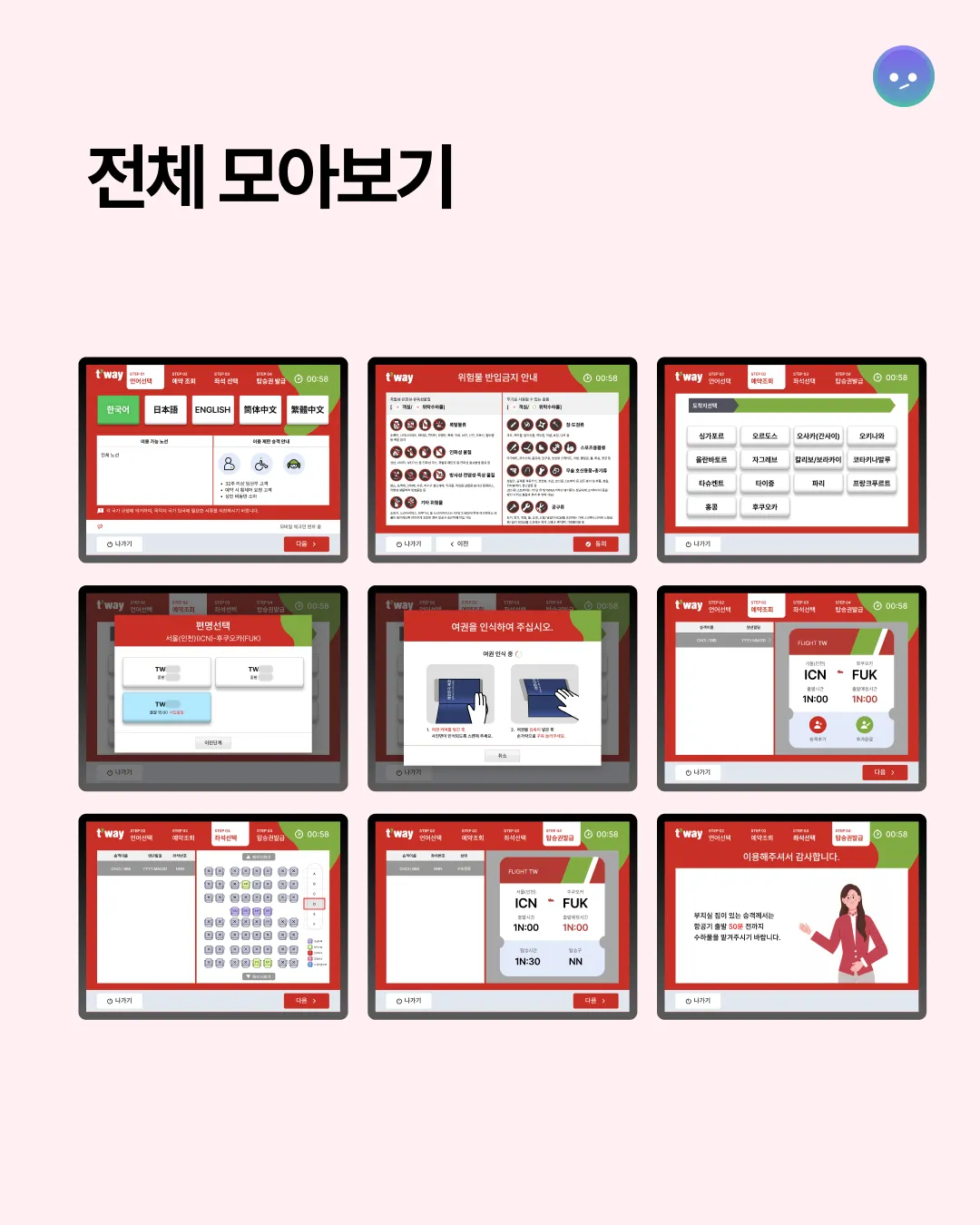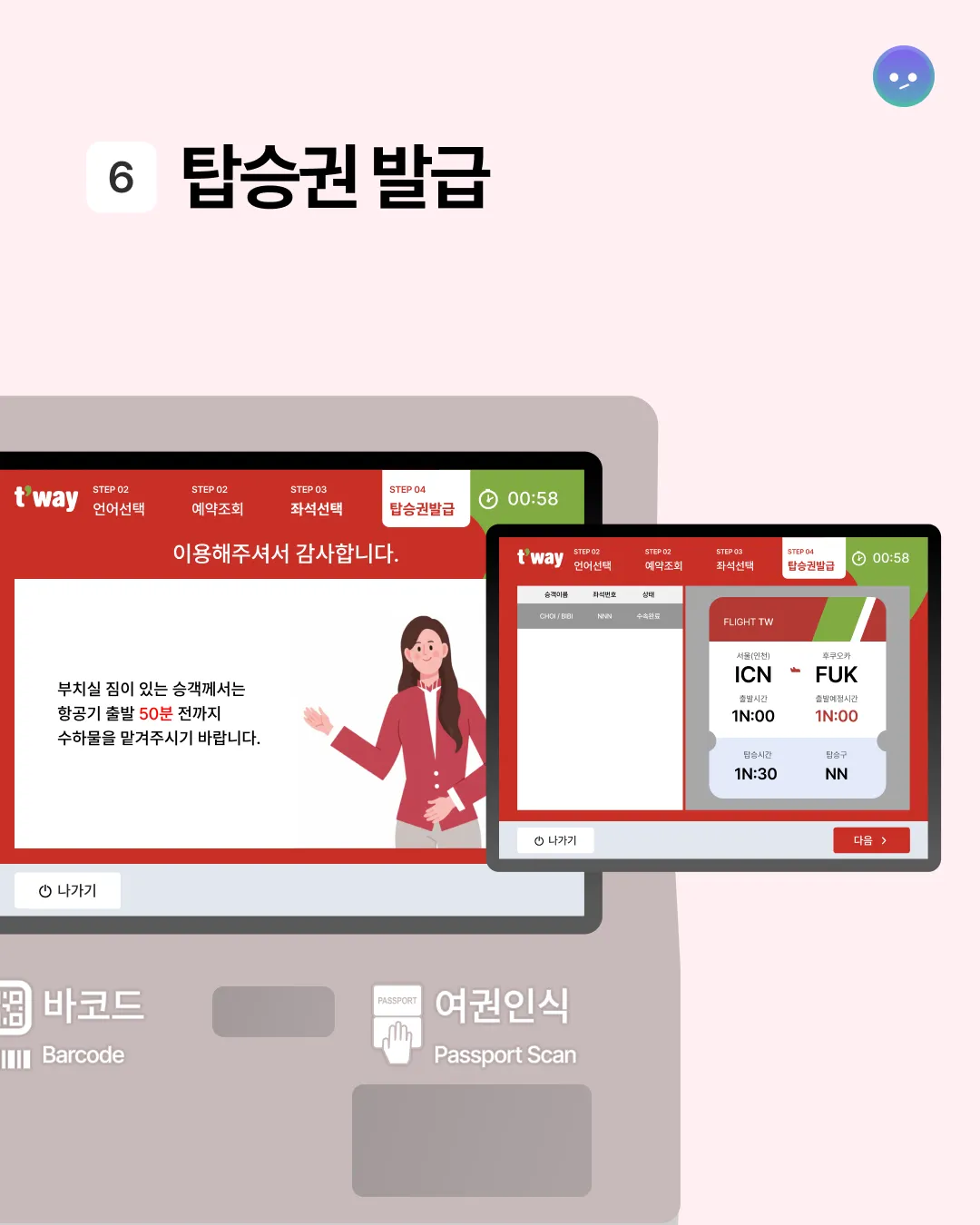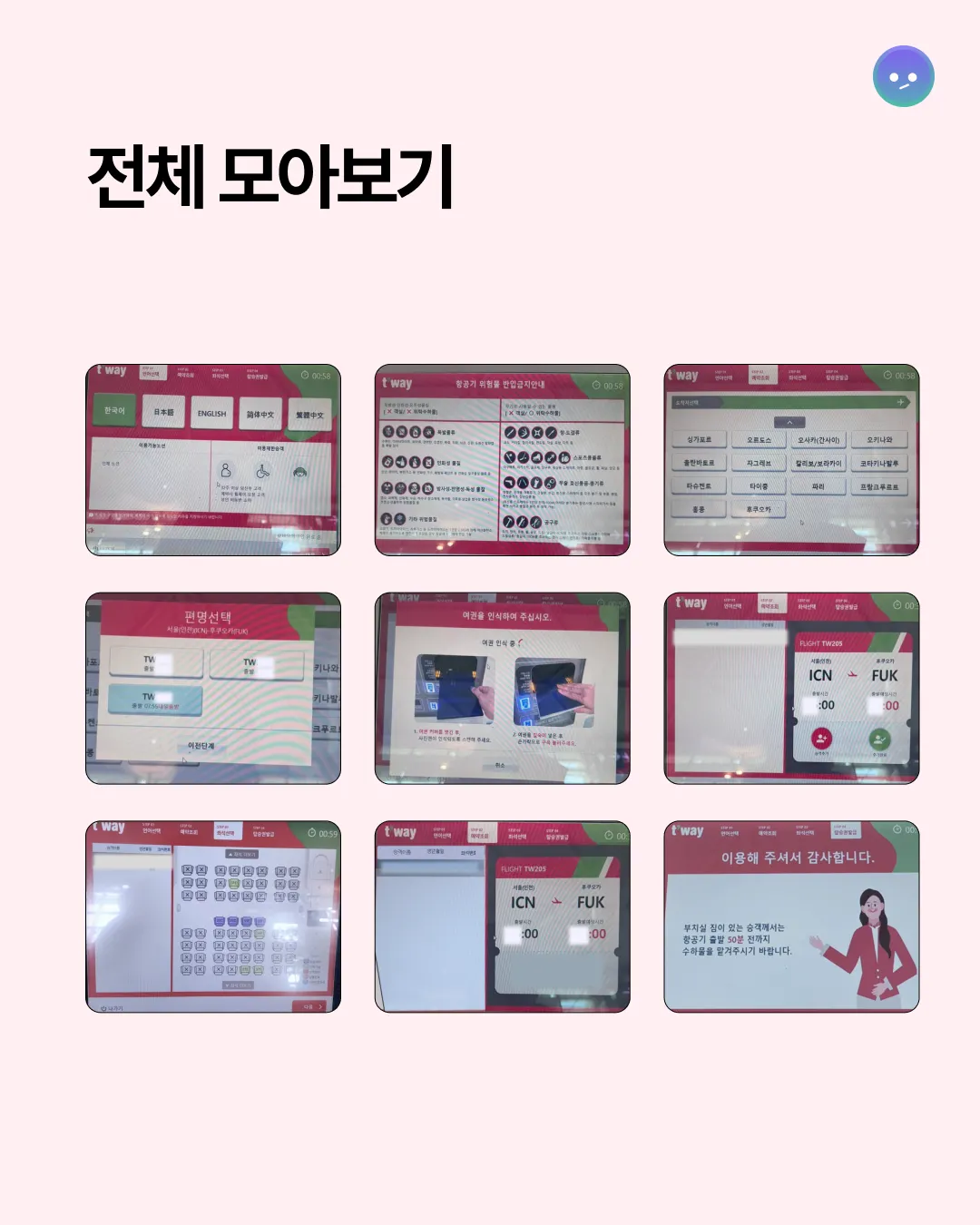오늘의 키오스크 화면 수집은 티웨이항공 셀프 체크인편입니다.