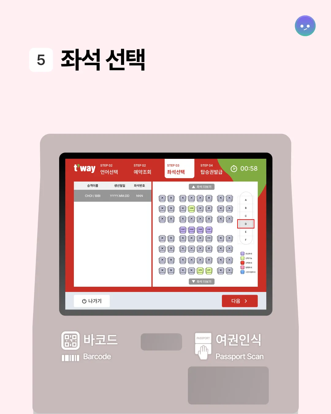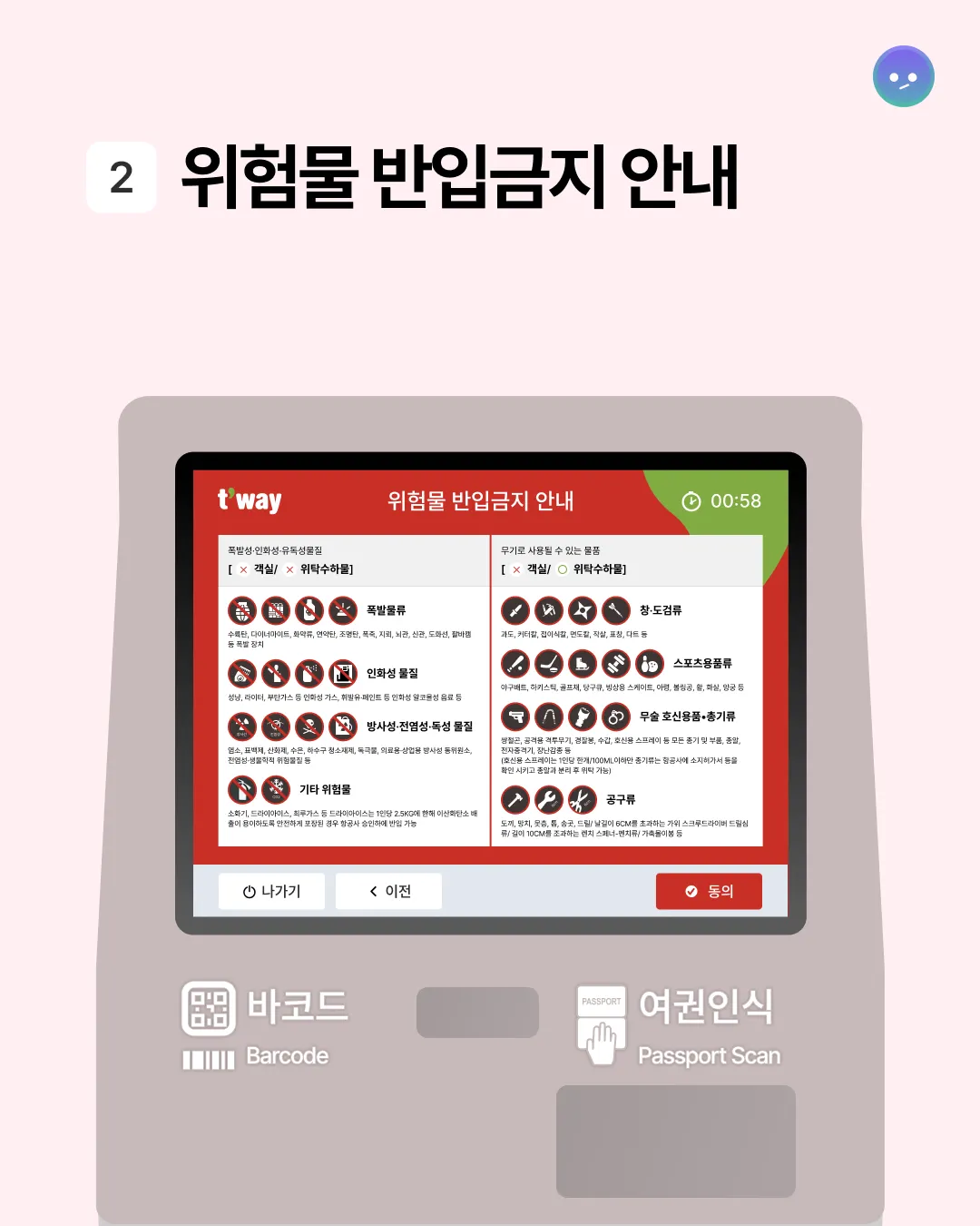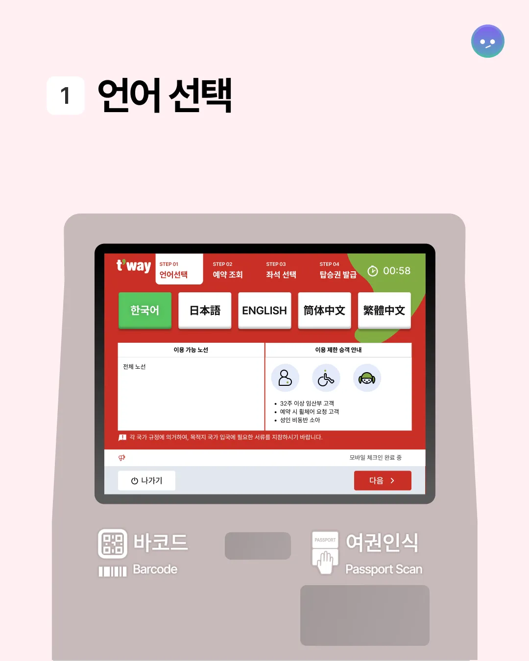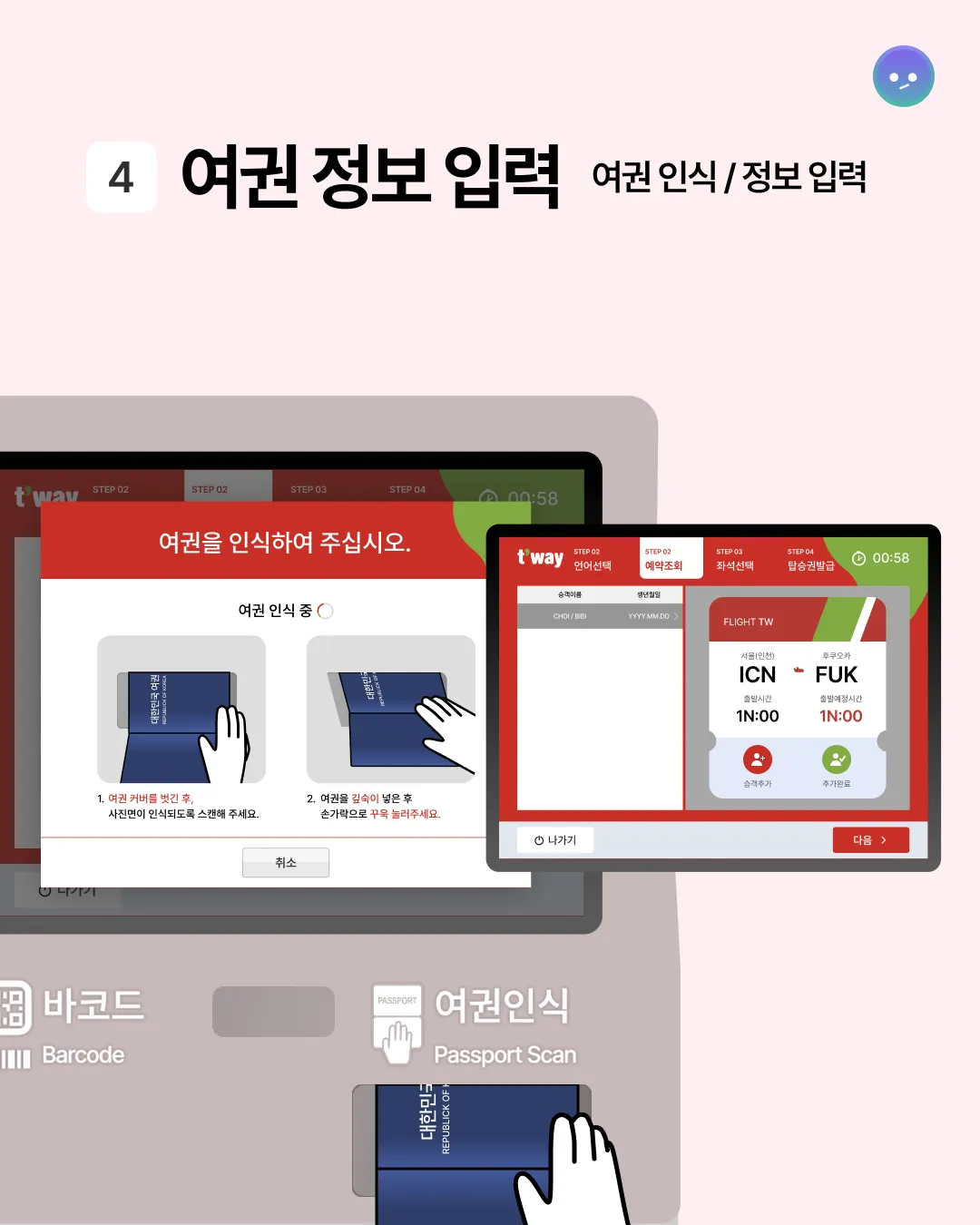 오늘의 키오스크 화면 수집은 티웨이항공 셀프 체크인편입니다.