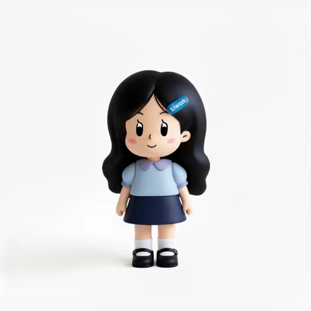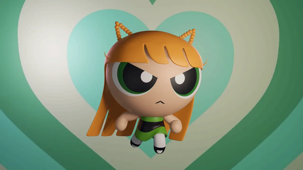 첫번째 이미지 속 캐릭터가 두번째 이미지의 [파워퍼프걸]이 된 모습 만들어줘. 단, 3D 스타일로 유지할 것.