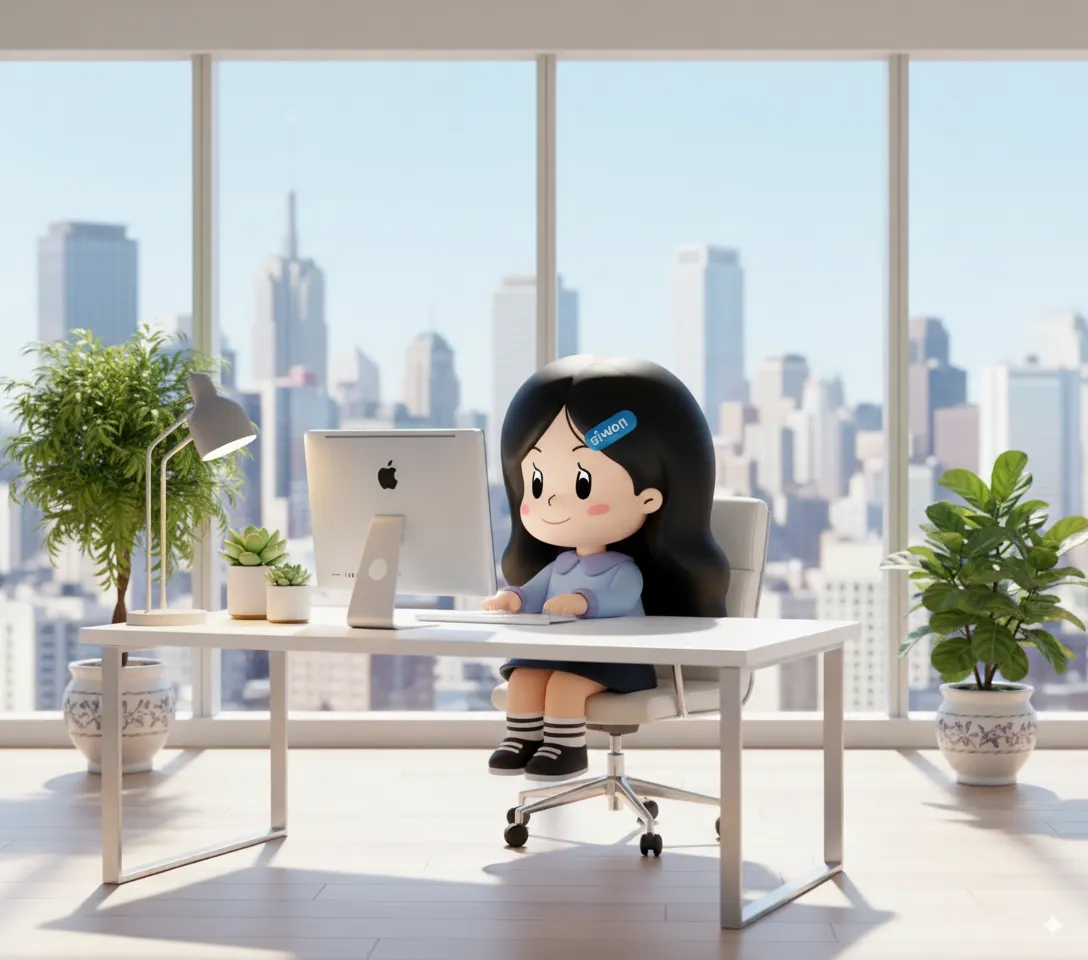 The character is sitting at a sleek white desk, working diligently on an iMac computer.