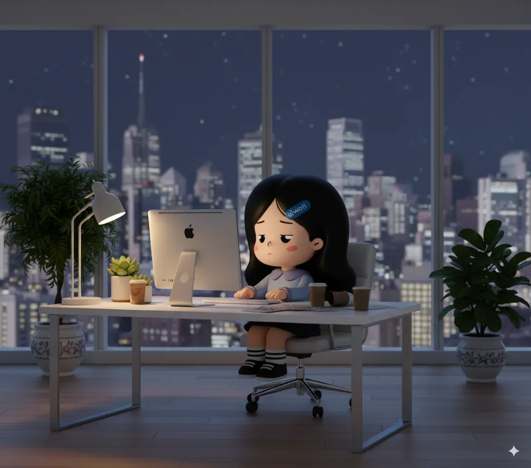 The overall mood should convey late-night overtime work — slightly exhausted, but still determined.