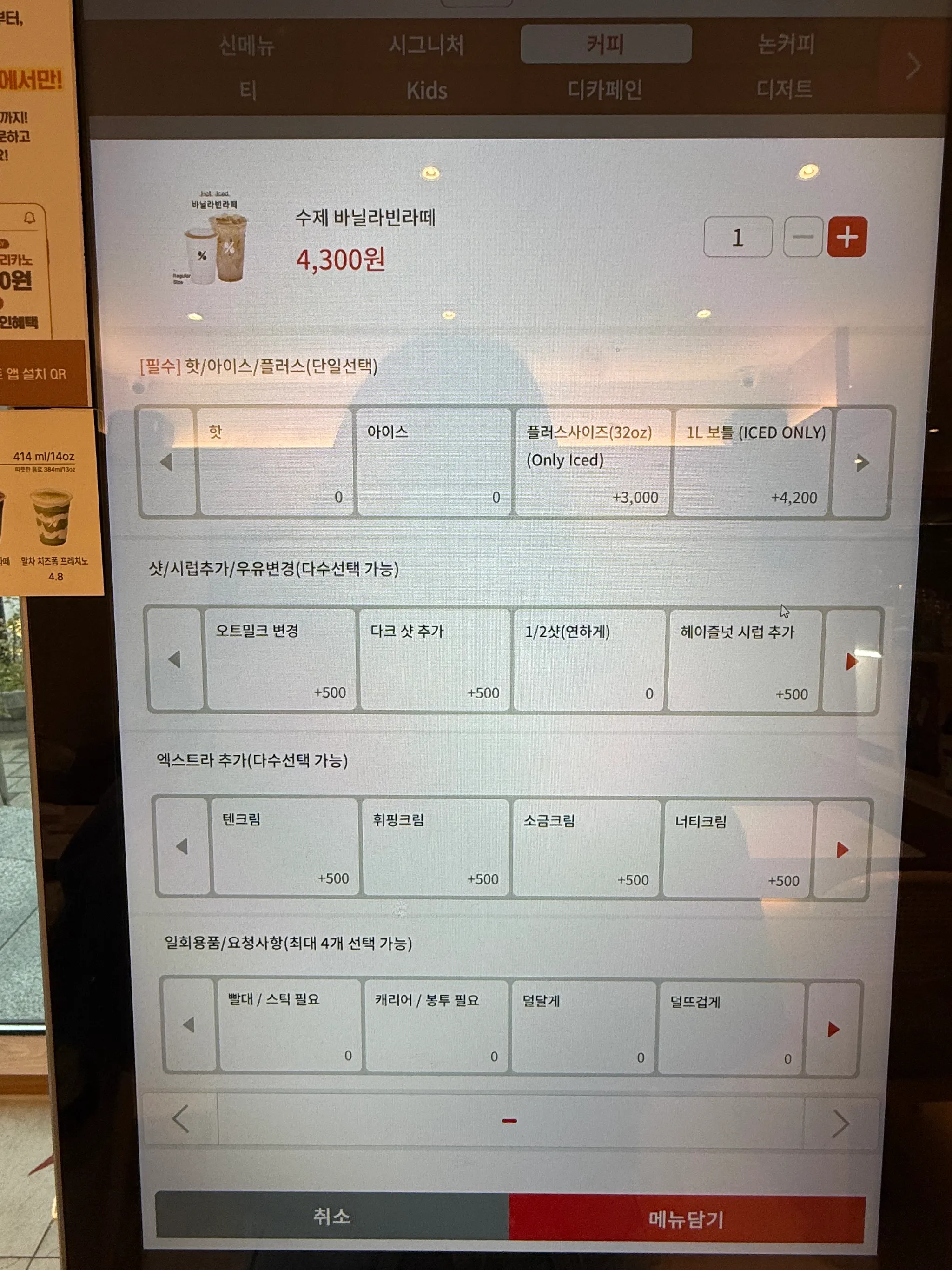 단계별 옵션 커스터마이징 - 필수/핫아이스/샷추가/시럽추가/토핑 등을 섹션별로 나누어 체계적으로 선택