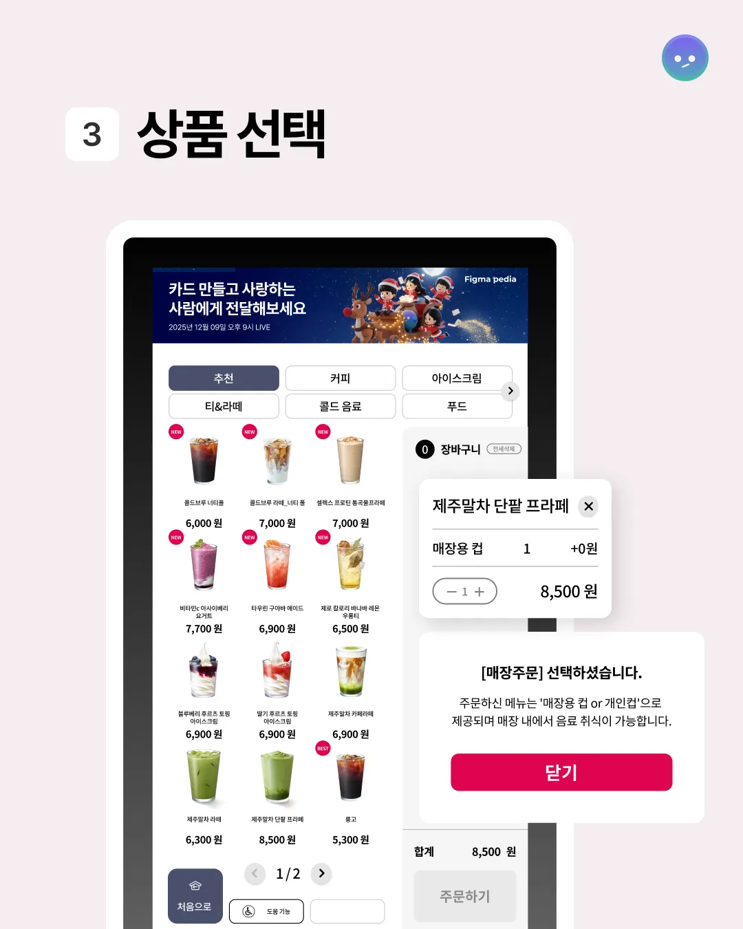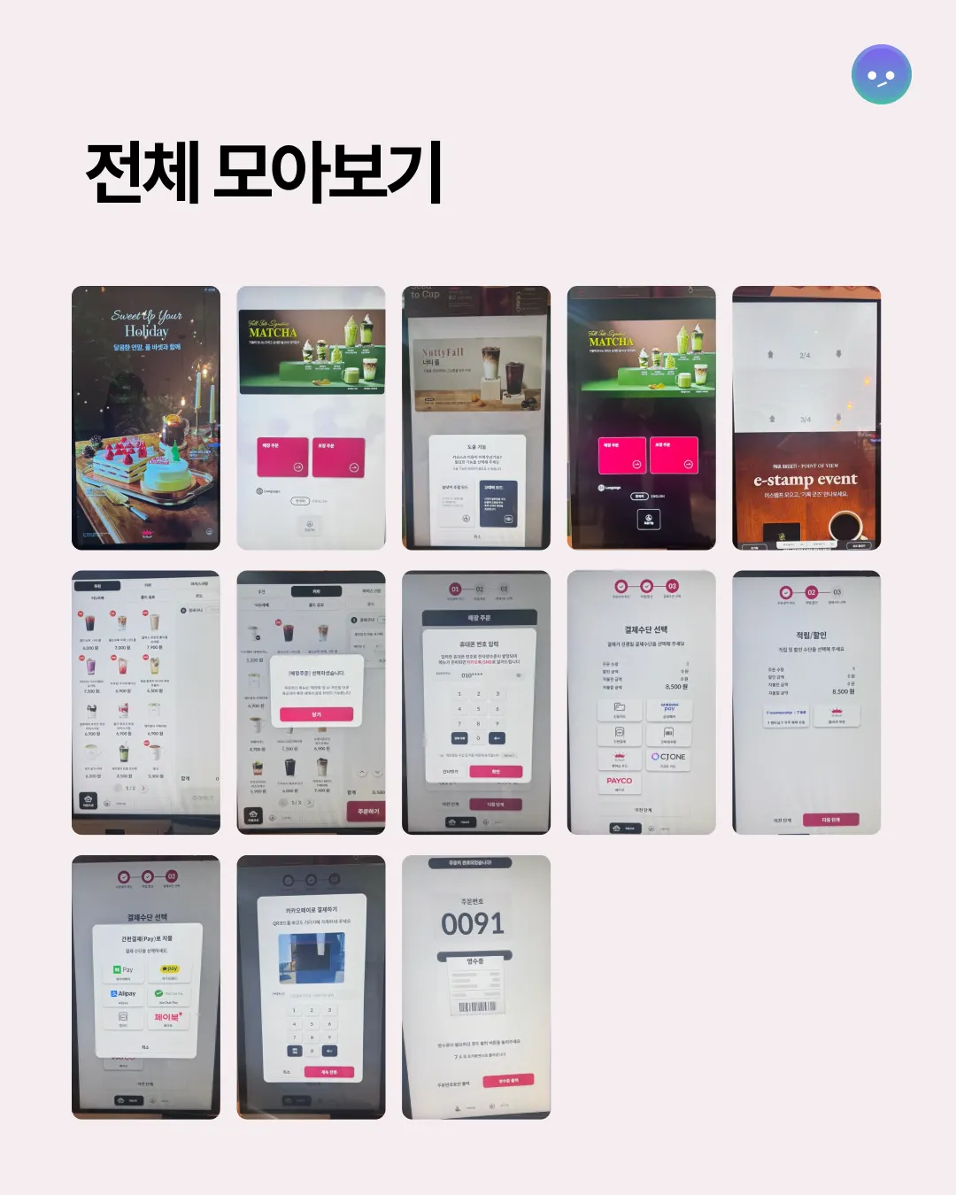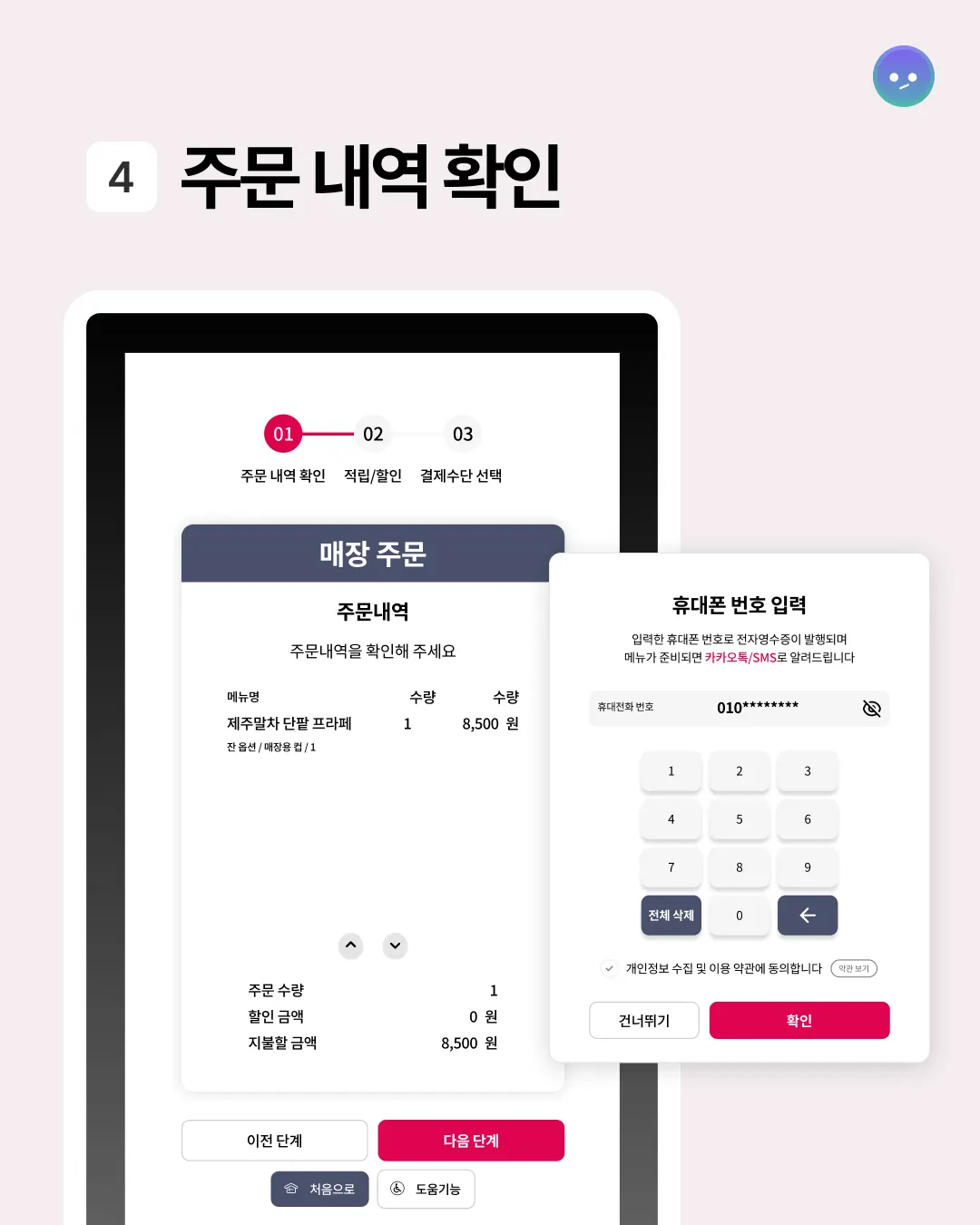 메뉴 선택, 주문 확인, 결제까지 단순하지만 직관적인 플로우로 이용이 쉽다.