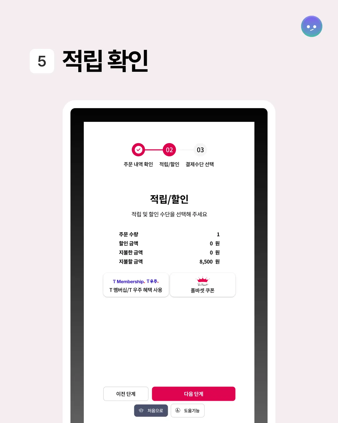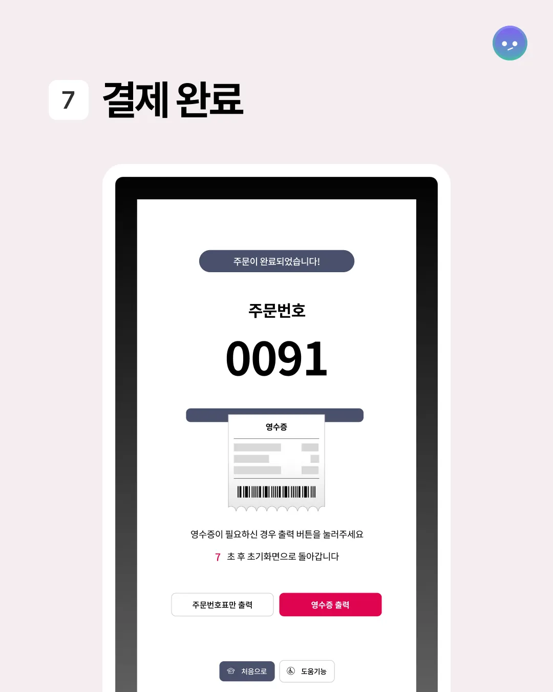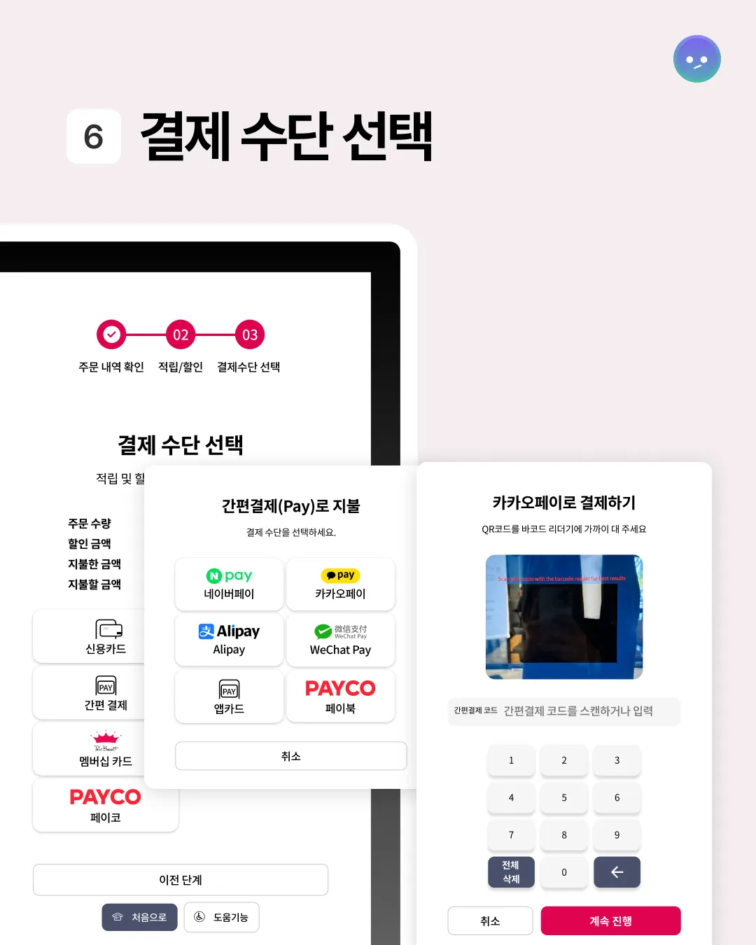 메뉴 선택, 주문 확인, 결제까지 단순하지만 직관적인 플로우로 이용이 쉽다.