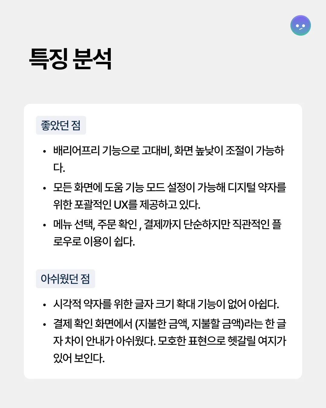 특징 분석 배리어프리 기능 탑재로 접근성을 높임. 하단 고정 GNB 영역에 항상 [도움 기능] 버튼을 배치하여 언제든 설정 변경 가능.