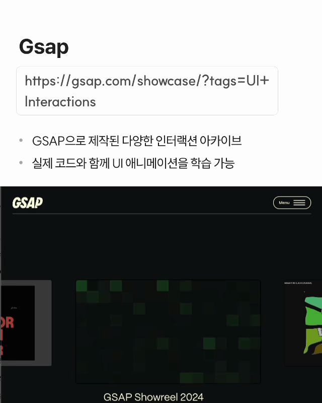 ✓ GSAP으로 제작된 다양한 인터랙션 아카이브 ✓ 실제 코드와 함께 UI 애니메이션을 학습 가능