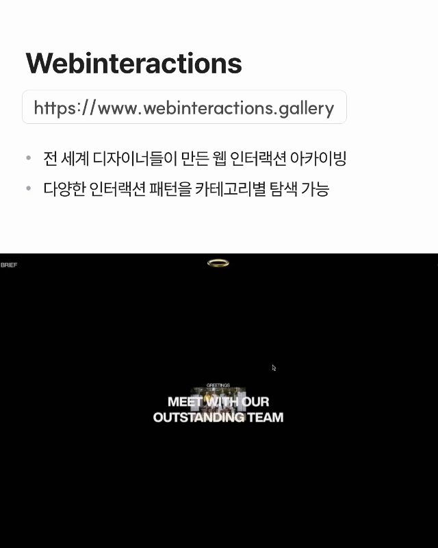 ✓ 전 세계 디자이너들이 만든 웹 인터랙션 아카이빙 ✓ 스크롤, 호버, 전환 효과 등 다양한 패턴을 카테고리별 탐색 가능