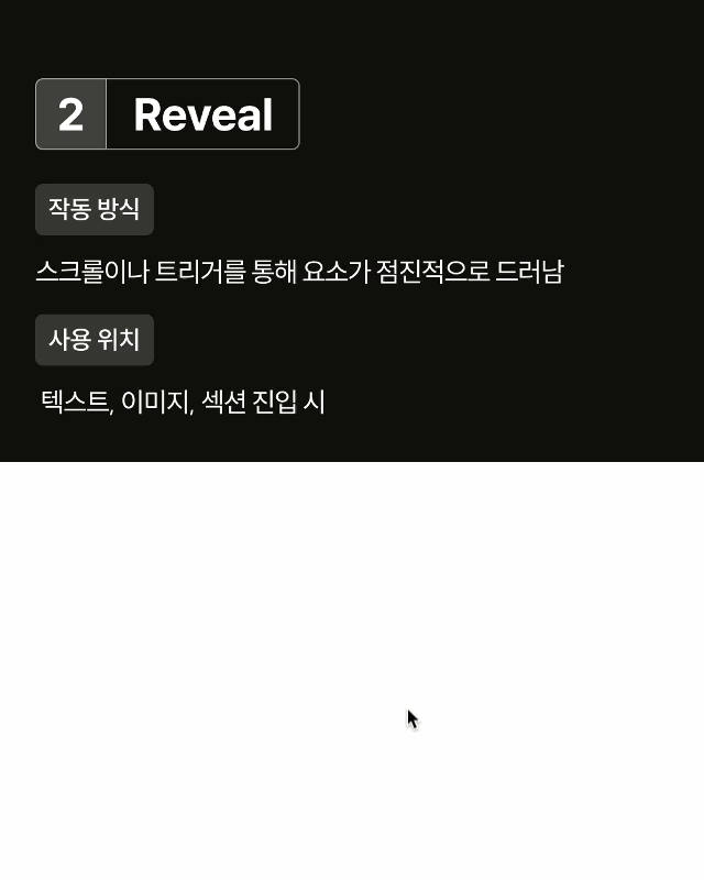 Reveal 클릭 또는 호버 시 숨겨진 요소를 노출하며, 노출 방향도 자유롭게 지정할 수 있어요. 이미지 카드, 리스트 등에 효과적입니다.
