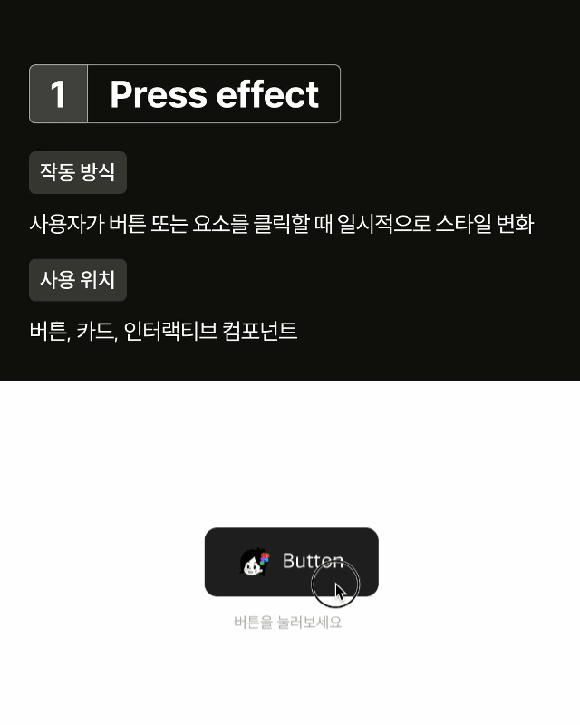 Press effect 클릭 시 버튼이나 카드에 시각적 ‘눌림’ 효과를 주고 크기·그림자를 변화시켜 인터랙션 피드백을 강화합니다.