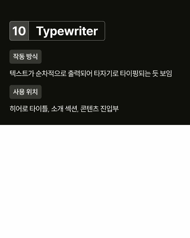 Typewriter 텍스트를 한 글자씩 나타나게 하여 시각적 주목도를 높입니다. 소개 섹션이나 타이틀에 효과적입니다.