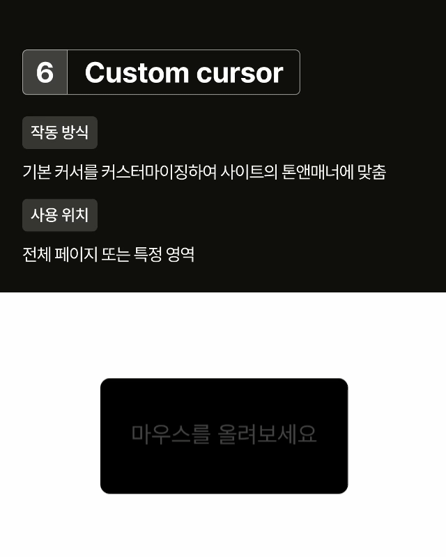 Custom cursor 특수 아이콘이나 브랜드에 맞춘 사용자 정의 커서를 적용해 인터랙션의 개성을 높입니다.