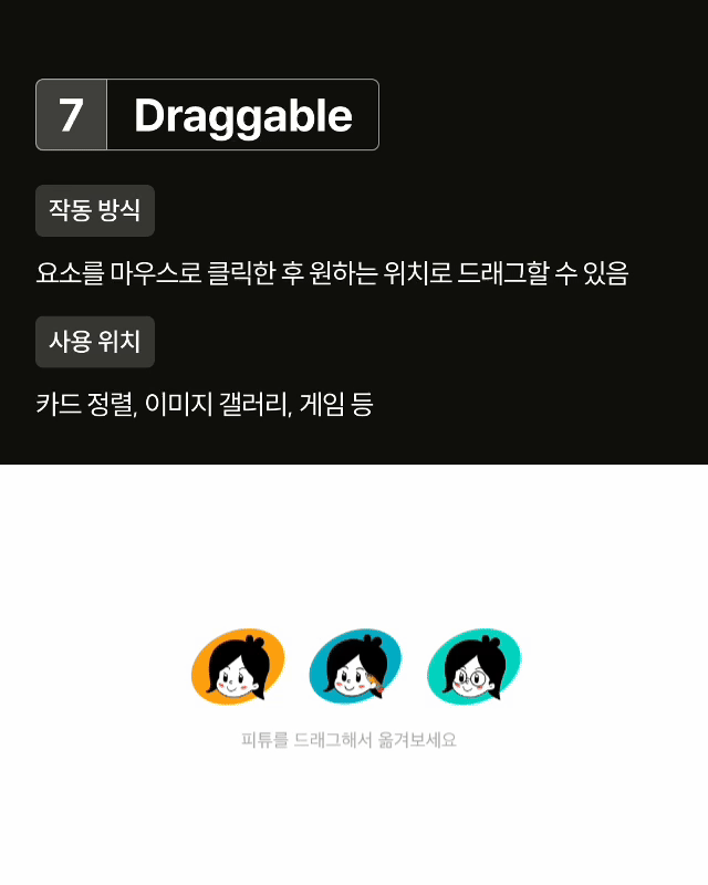 Draggable 드래그로 오브젝트를 움직일 수 있게 해줍니다. 이미지나 카드 등 제한적인 상호작용에 적합합니다.