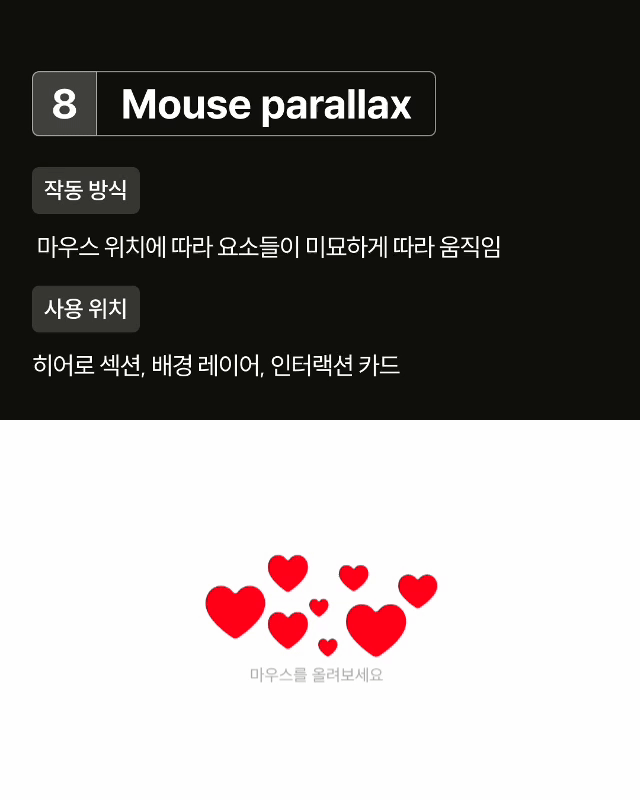 Mouse parallax 마우스 이동에 따라 배경이나 이미지가 반응하여 입체감을 구현합니다.