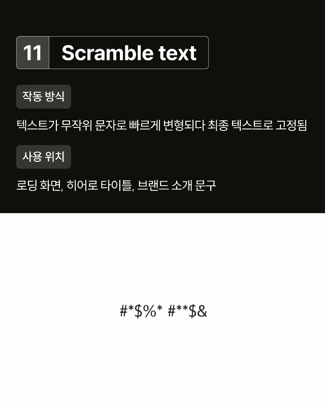 Scramble text 문자가 무작위로 섞였다가 실제 텍스트로 변환되는 애니메이션입니다. 로딩 화면이나 키 비주얼에 활용됩니다.