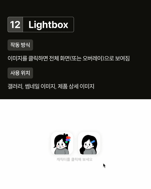 Light box 이미지를 클릭하면 확대하고 배경을 어둡게 처리해 집중도를 높입니다. 썸네일 클릭 시 상세 보기 기능으로 자주 쓰입니다.