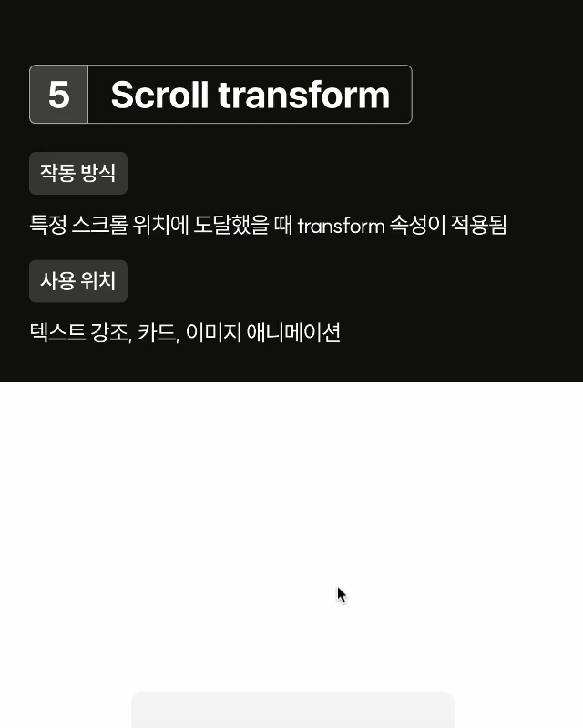 Scroll transform 스크롤 시 특정 요소의 위치나 크기를 변화시켜 동적인 페이지 흐름을 만듭니다.