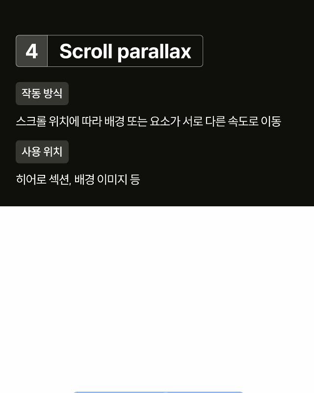 Scroll parallax 스크롤에 따라 배경이나 이미지가 다른 속도로 이동해 깊이감을 주는 효과입니다. 히어로 이미지나 랜딩 페이지에서 많이 사용됩니다.
