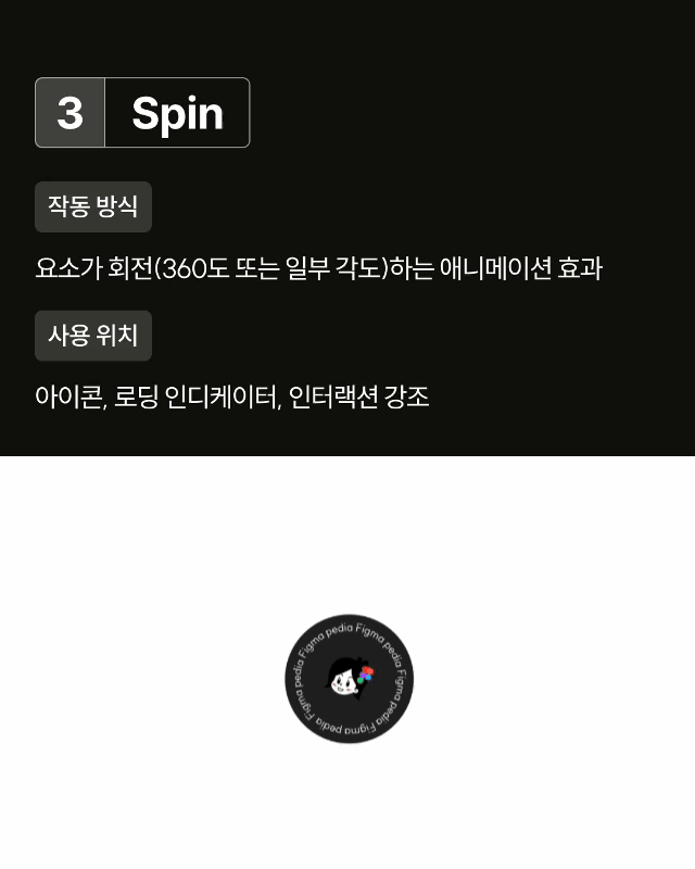Spin 자동으로 지속 회전하는 애니메이션입니다. 회전 속도와 방향을 설정할 수 있어 로딩 아이콘이나 배경 요소에 활용됩니다.