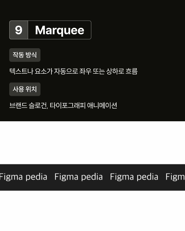 Marquee 텍스트 배너나 로고를 반복 스크롤시키는 효과입니다. 속도와 방향을 조절할 수 있어 무한 슬라이드에 유용합니다.