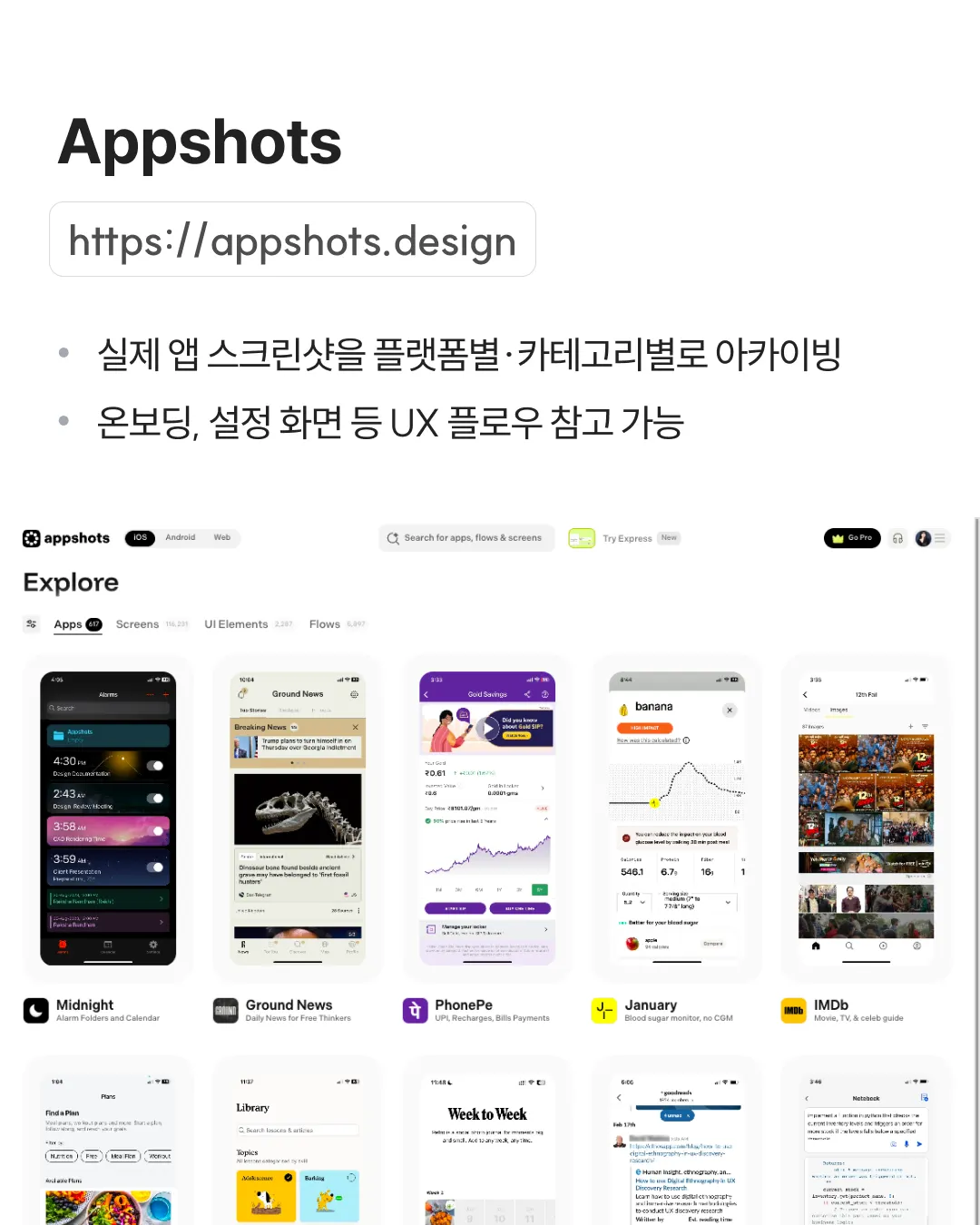 ✓ 실제 앱 스크린샷을 플랫폼별·카테고리별로 아카이빙 ✓ 온보딩, 설정 화면 등 UX 플로우 참고 가능