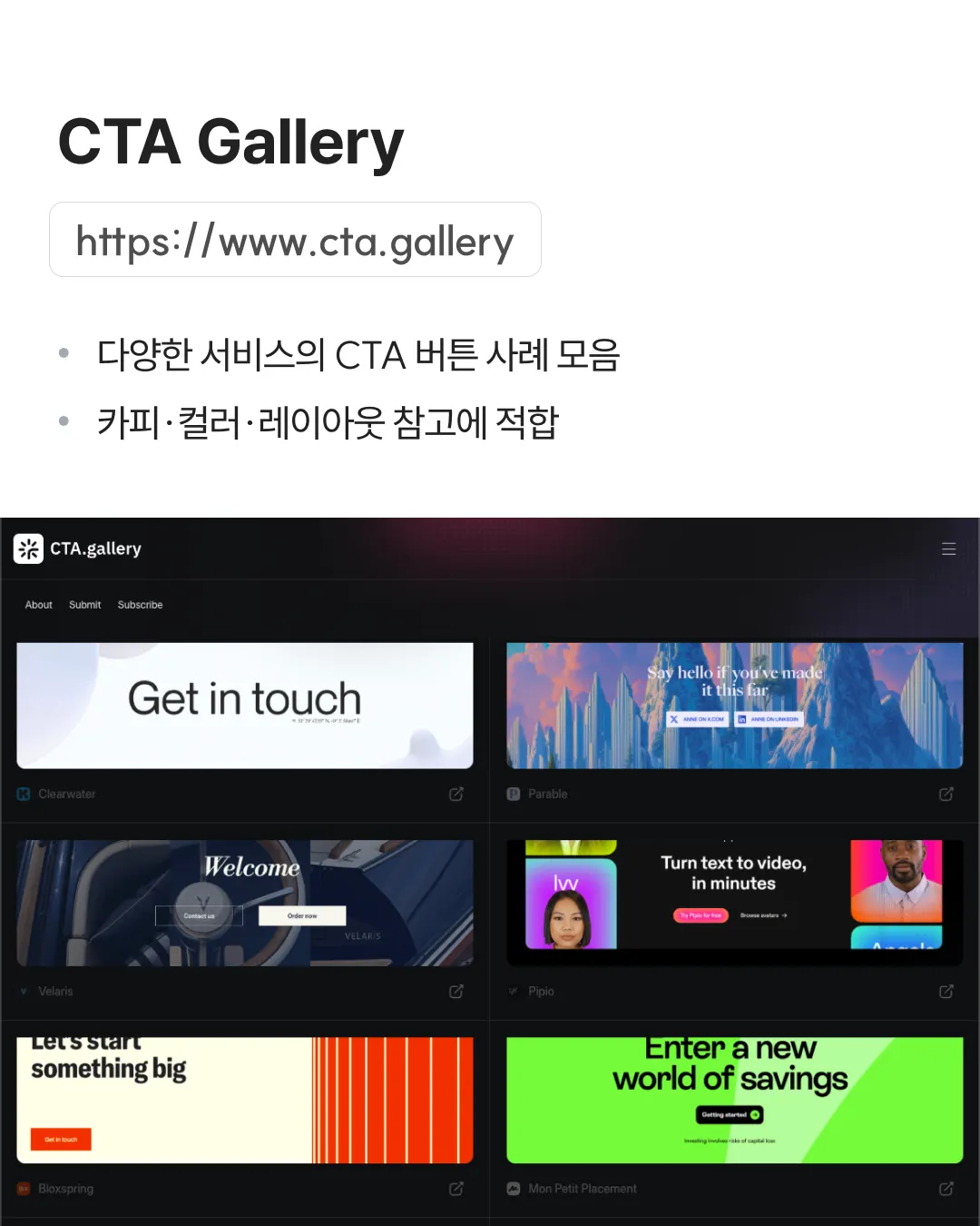 ✓ 다양한 서비스의 CTA 버튼 사례 모음 ✓ 카피·컬러·레이아웃 참고에 적합