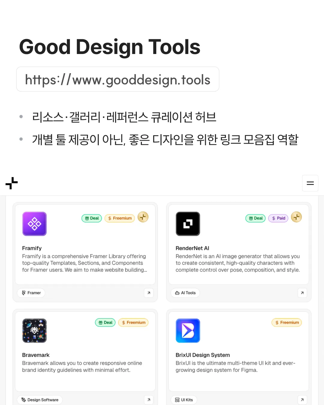 ✓ 디자이너와 크리에이터를 위한 리소스·갤러리·레퍼런스 큐레이션 허브 ✓ 개별 툴 제공이 아닌, 좋은 디자인을 위한 링크 모음집 역할