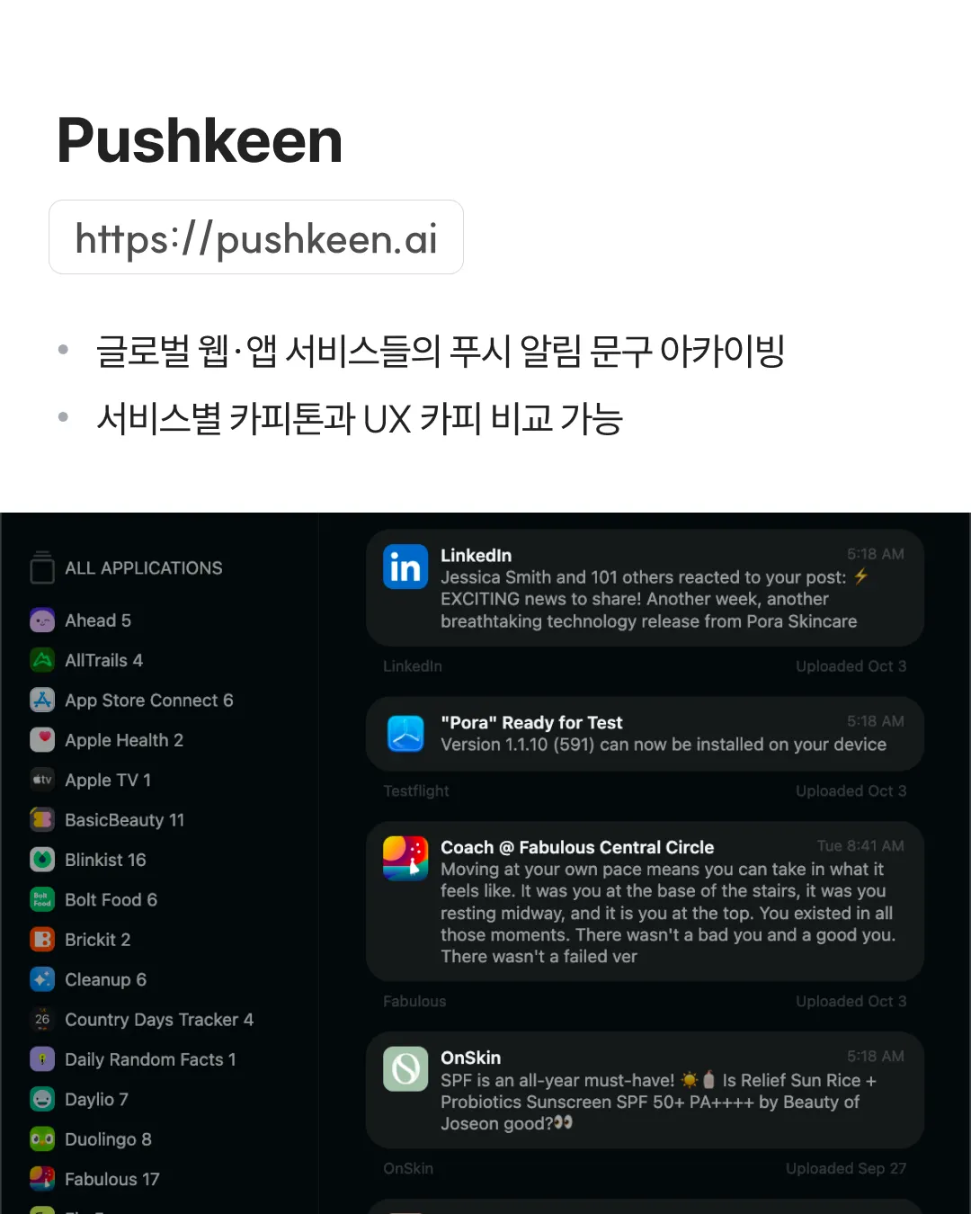 ✓ 글로벌 웹·앱 서비스들의 푸시 알림 문구 아카이빙 ✓ 서비스별 카피톤과 UX 카피 비교 가능