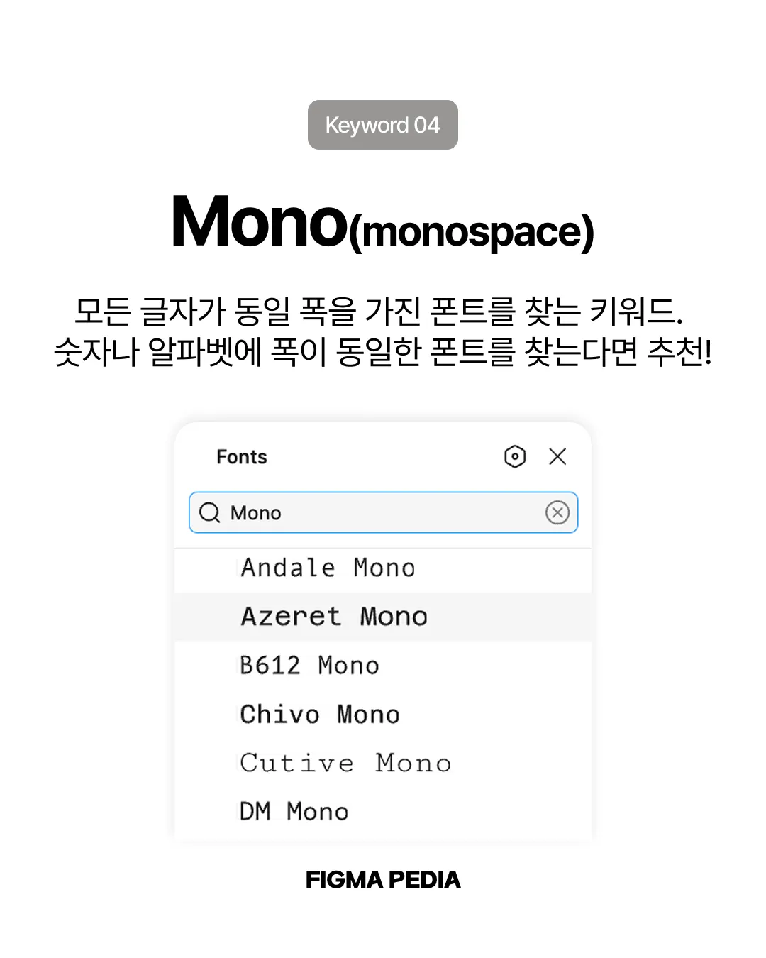 Mono(monospace) : 모든 글자가 동일 폭을 가진 폰트를 찾는 키워드. 숫자나 알파벳에 폭이 동일한 폰트를 찾는다면 추천!