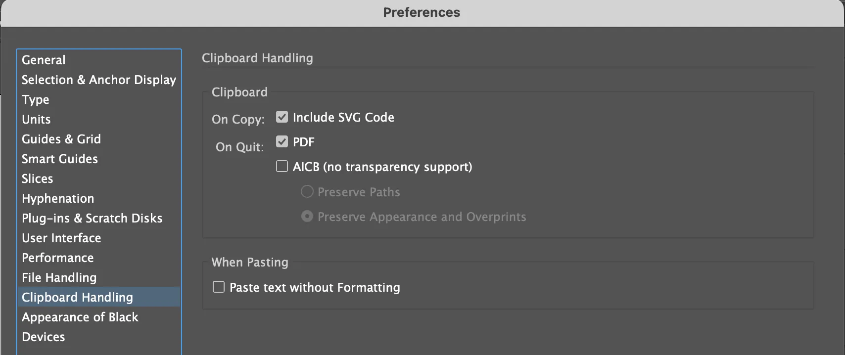 : preferences > Clipboard Handling > on copy : include SVG code 체크하기