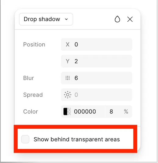 "Show behind transparent areas" 체크 시: 이 옵션을 선택하면, 섀도우가 요소의 전체 경계를 기준으로 생성되며, 요소의 투명한 영역 뒤에도 섀도우가 보이게 됩니다.