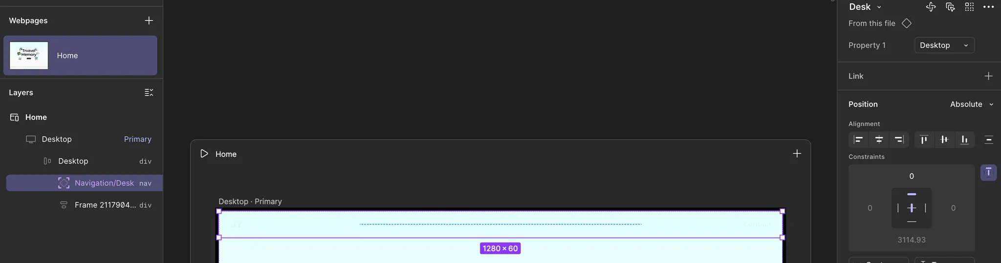 강의에서 제공한 템플릿은 한번에 웹에 적용하기 위해 오토레이아웃으로 묶었는데요, 현재 네비게이션 바가 'Desktop'이라는 오토레이아웃 프레임의 자식 요소로 들어가 있어서 위치 설정에 제한이 걸린 상태입니다.