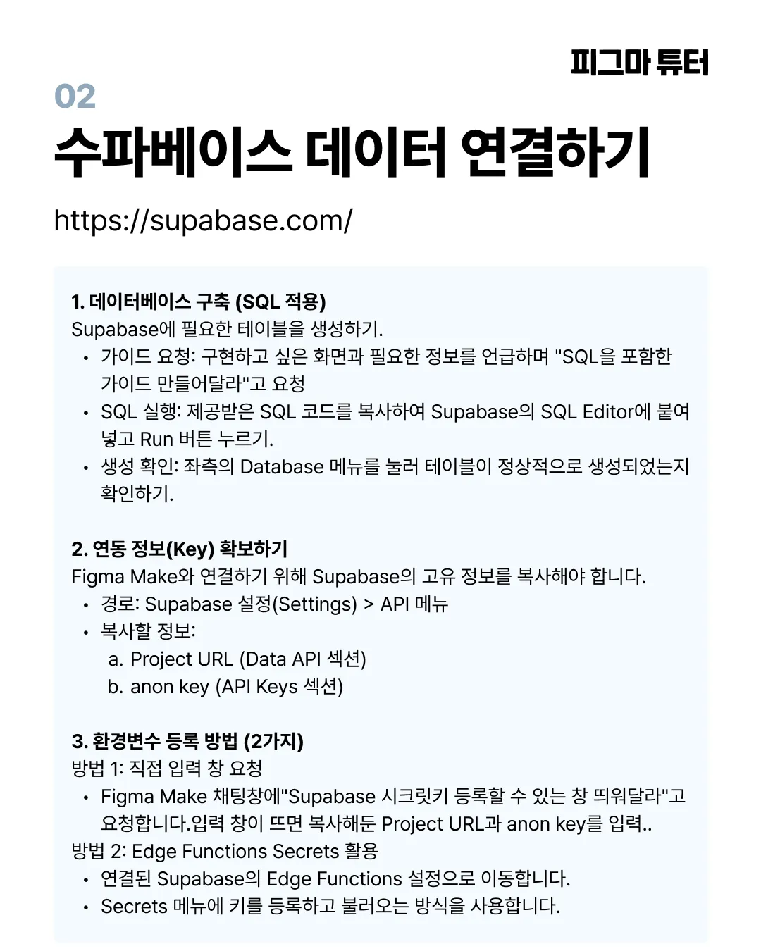 Figma Make 채팅창에"Supabase 시크릿키 등록할 수 있는 창 띄워달라"고 요청합니다.입력 창이 뜨면 복사해둔 Project URL과 anon key를 입력..