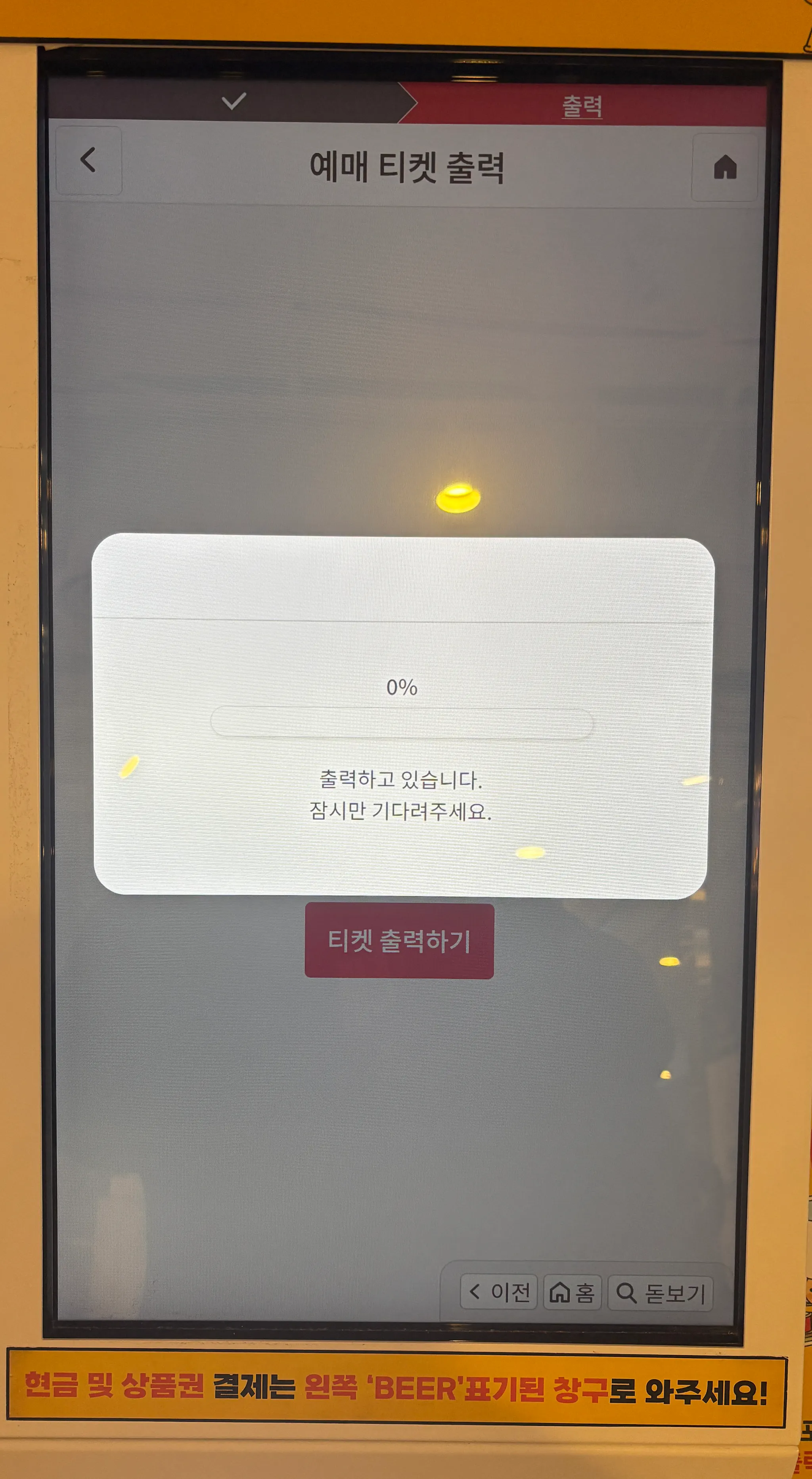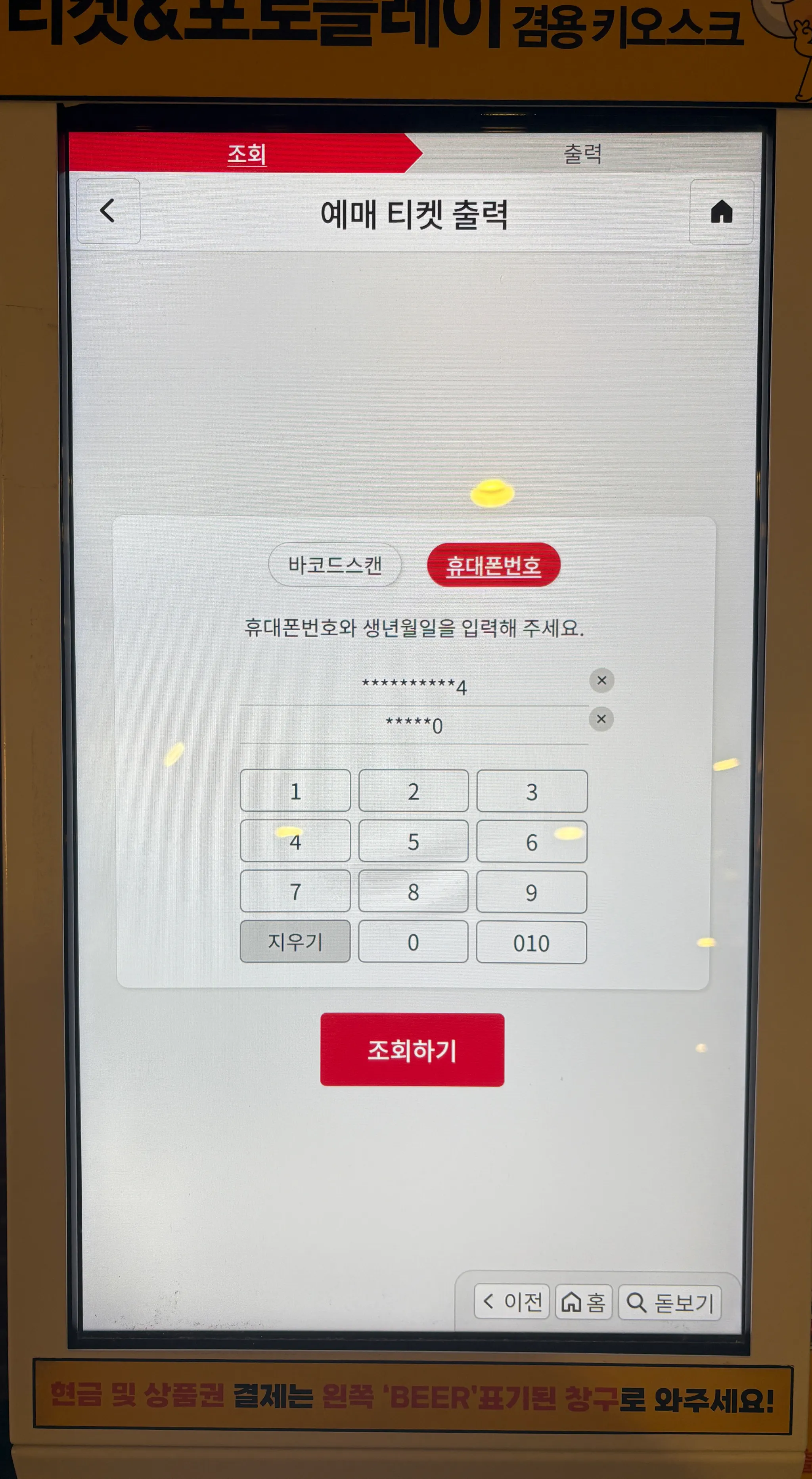 키오스크 전체 과정 중 미리 예매한 표 출력과 현장 예매 과정을 담았습니다.