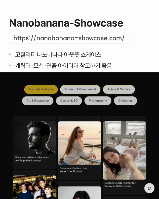 ✓ 고퀄리티 나노바나나 아웃풋 쇼케이스 ✓ 캐릭터·모션·연출 아이디어 참고하기 좋음