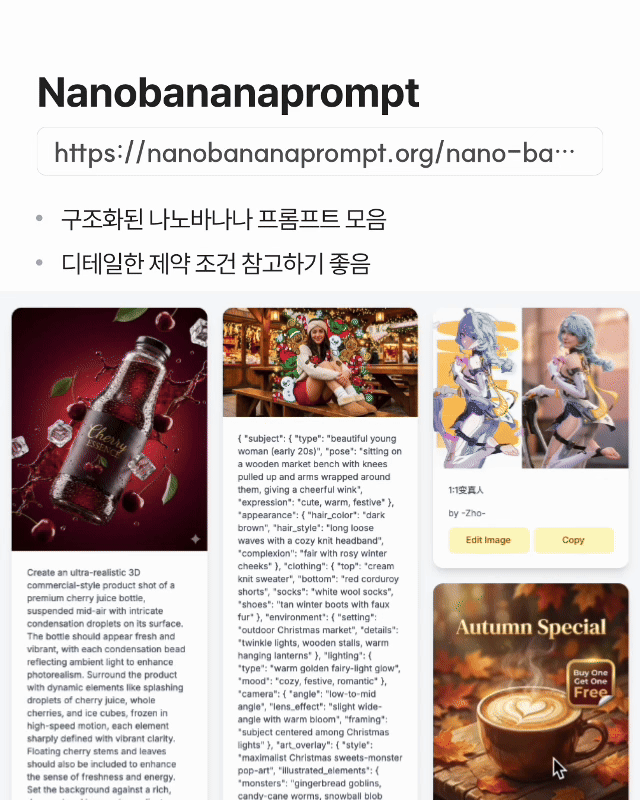 ✓ 구조화된 나노바나나 프롬프트 모음 ✓ 디테일한 제약 조건 참고하기 좋음