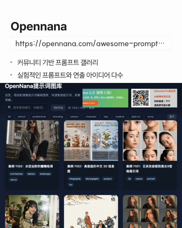 ✓ 커뮤니티 기반 프롬프트 갤러리 ✓ 실험적인 프롬프트와 연출 아이디어 다수