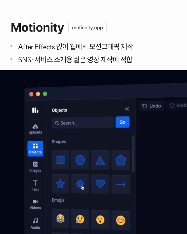 ✓ After Effects 없이 웹에서 모션그래픽 제작 ✓ SNS·서비스 소개용 짧은 영상 제작에 적합