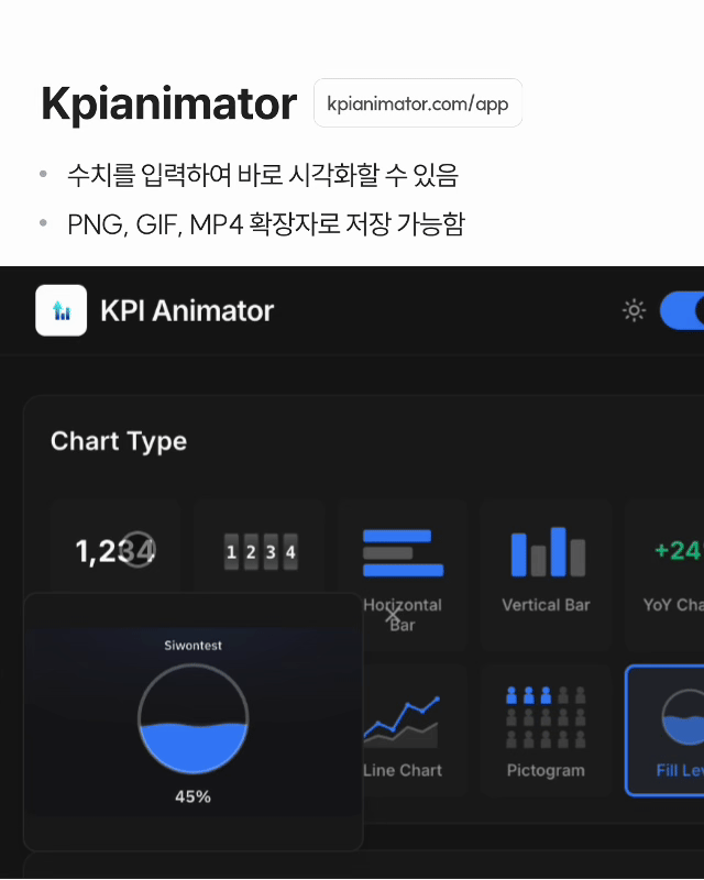 ✓ 수치를 입력하면 즉시 애니메이션으로 시각화 ✓ KPI, 지표 설명용 콘텐츠 제작에 적합 ✓ PNG, GIF, MP4 등 다양한 포맷으로 바로 저장 가능