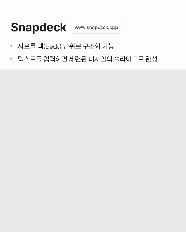 ✓ 자료를 덱(deck) 단위로 구조화 가능 ✓ 텍스트를 입력하면 즉시 세련된 디자인의 카드/슬라이드로 완성