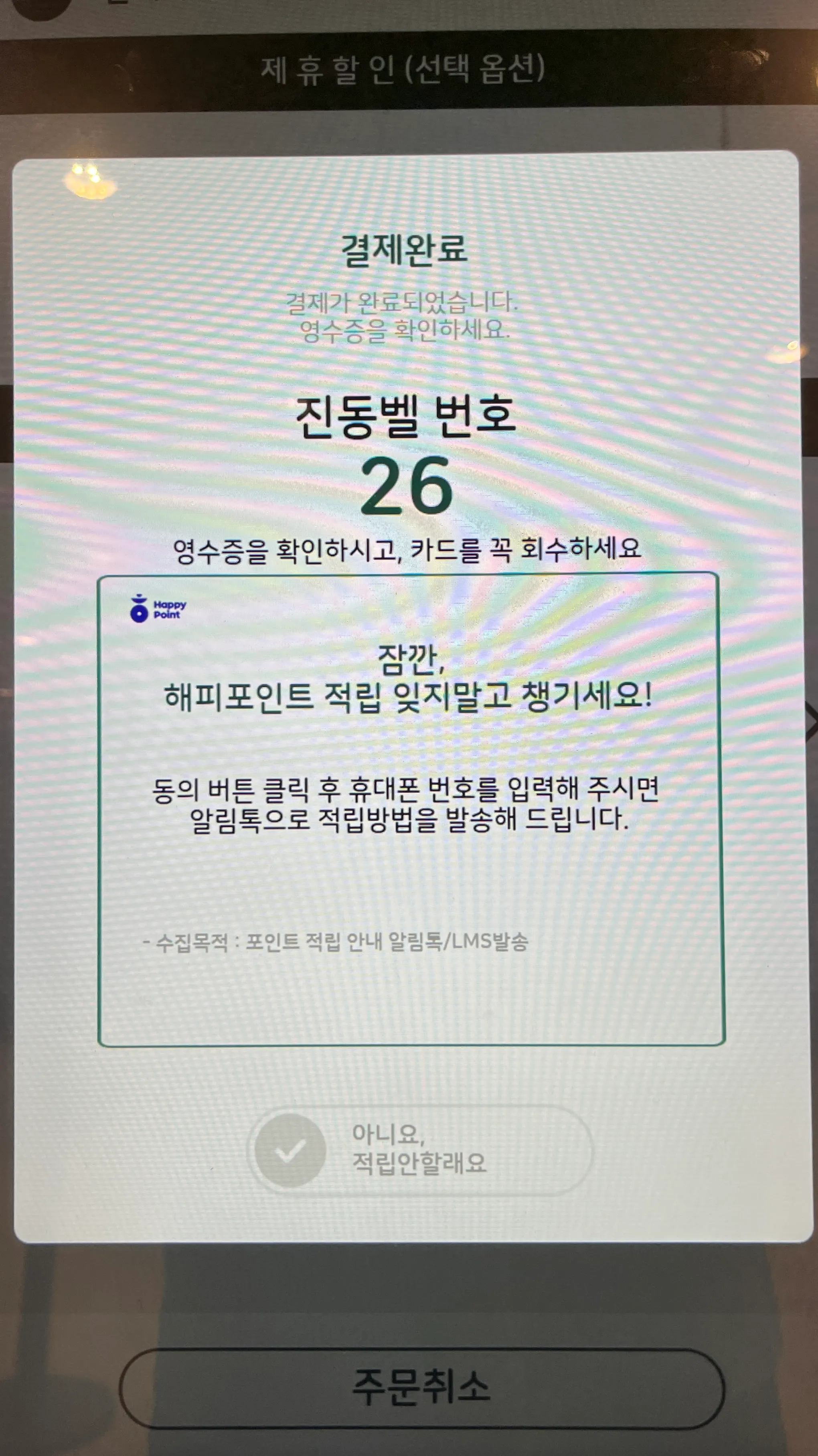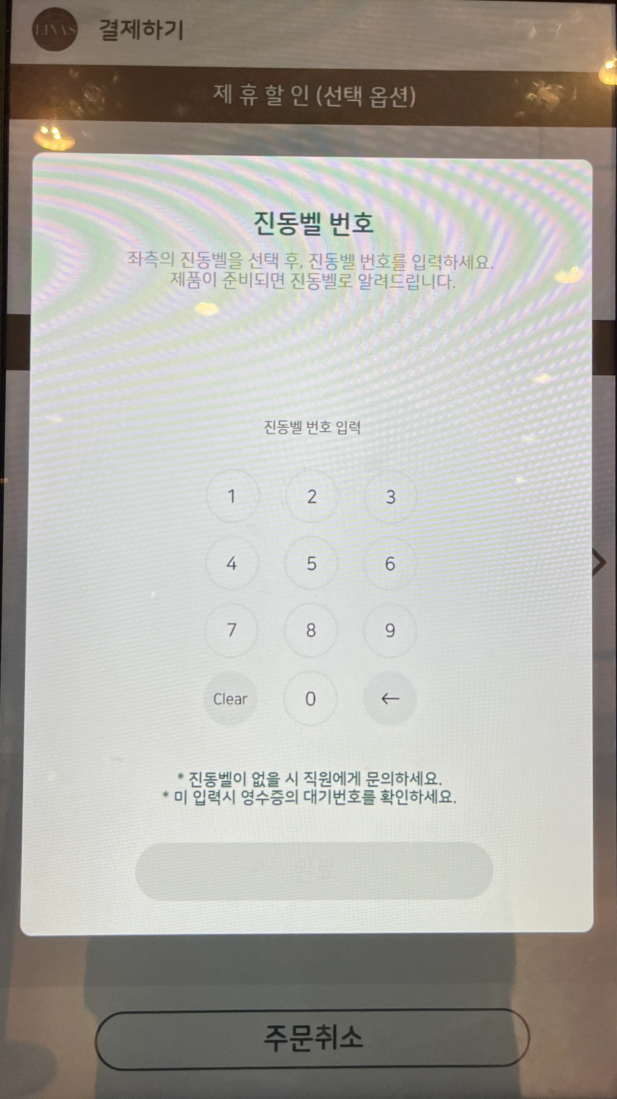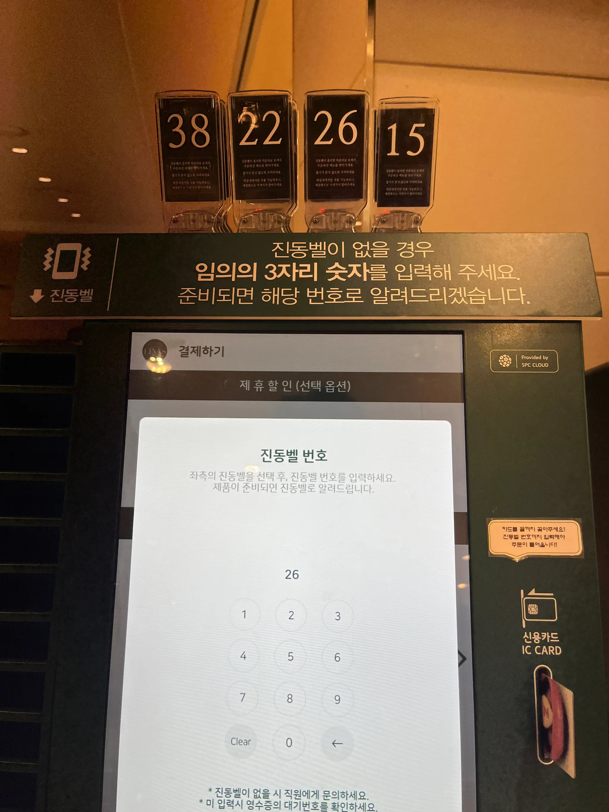 다만 사용에 적응이 안되었던 점을 꼽자면, ‘진동벨 번호’를 입력하는 구간이 이해가 안되었다. 키오스크 위에 배치한 진동벨을 챙기고 진동벨의 번호를 입력하면 제품 픽업 시, 진동벨을 통해 신호를 주는 구조인데 이런 경험이 많이 있지않은 사용자에게는 키오스크 사용이 약간 어렵지 않을까? 싶었다. 심지어 화면에는 ‘좌측의 진동벨’을 선택하라고 되어있지만 실제로 진동벨은 키오스크 상단에 있었다. 진동벨 위치 변경에 따라 위치를 제대로 알려주면 더 좋겠다.