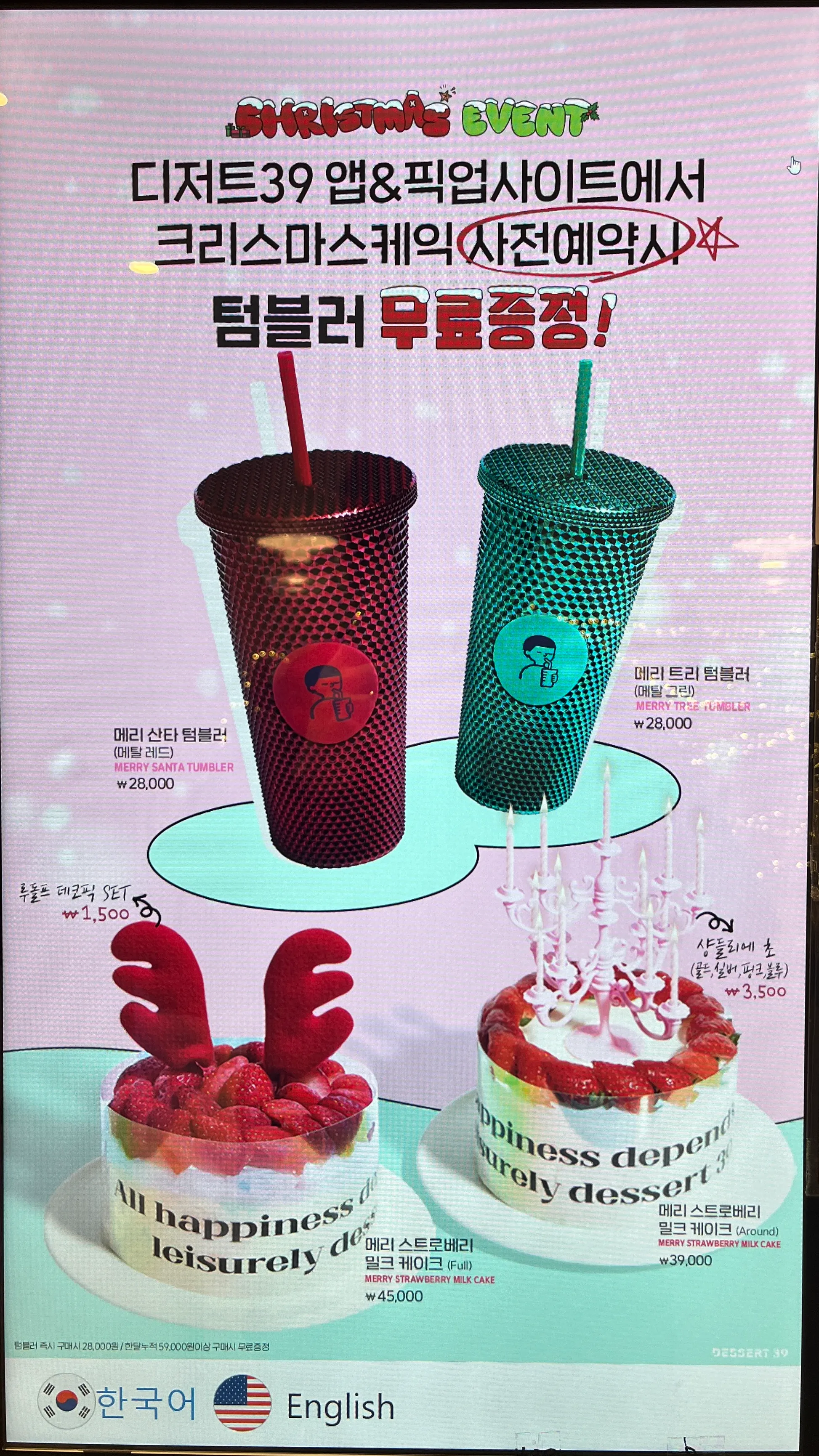 원두를 사용한 다양한 커피와 각 나라를 대표하는 39종류의 디저트를 판매하고 있다.